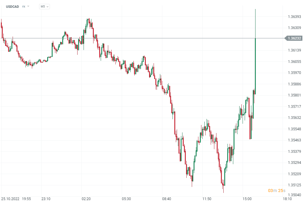 Wykres USDCAD, interwał M5. Amerykański dolar umacnia się w relacji do dolara kanadyjskiego po gołębiej decyzji BoC. Źródło: xStation5