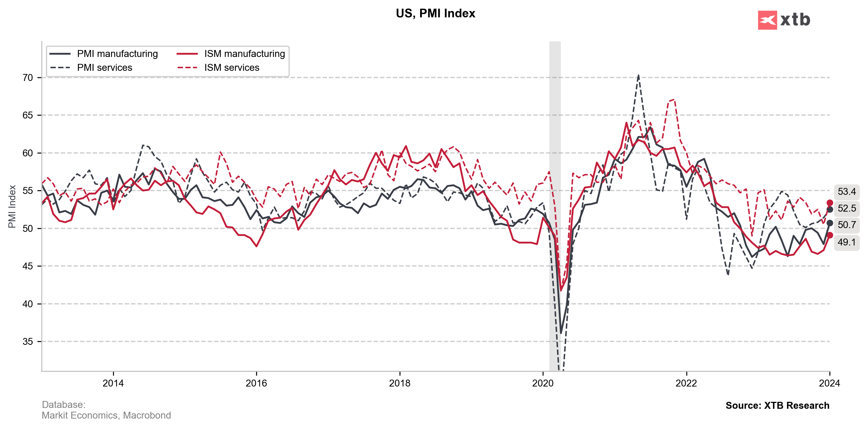 Indeks ISM dla usług również może wskazywać, że gospodarka "osiągnęła już dołek" i oczekuje się przyspieszenia aktywności gospodarczej. Warto zauważyć, że odbicie nie wynika tylko i wyłącznie z cen, ale również z wyższych zamówień czy lepszej sytuacji na rynku pracy. Źródło: Macrobond, XTB