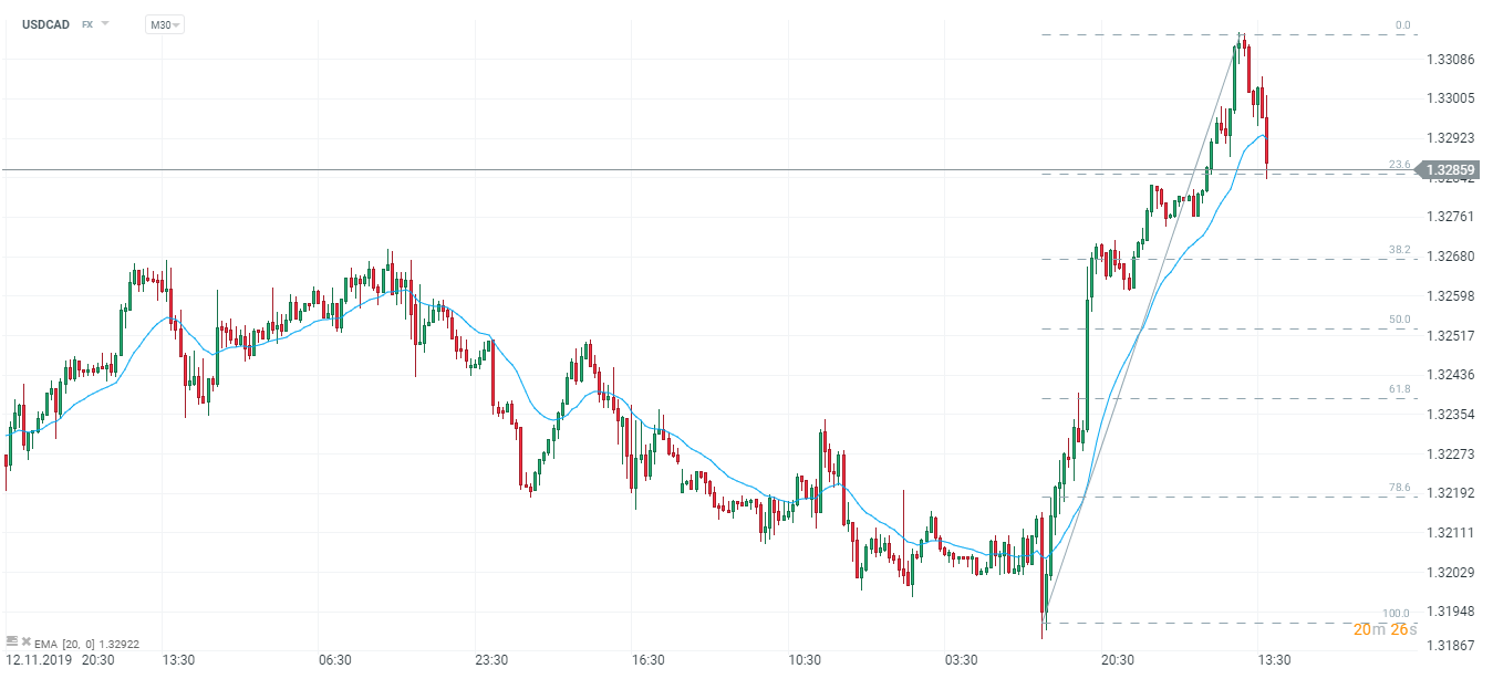 W reakcji na powyższe dane dolar kanadyjski umocnił się w stosunku do jego amerykańskiego odpowiednika o ok. 15 pipsów. Aktualnie kurs znajduje się na granicy 23,6% zniesienia Fibo, które po przełamaniu, może otworzyć drogę do pułapu 1,3267. Źródło: xStation5