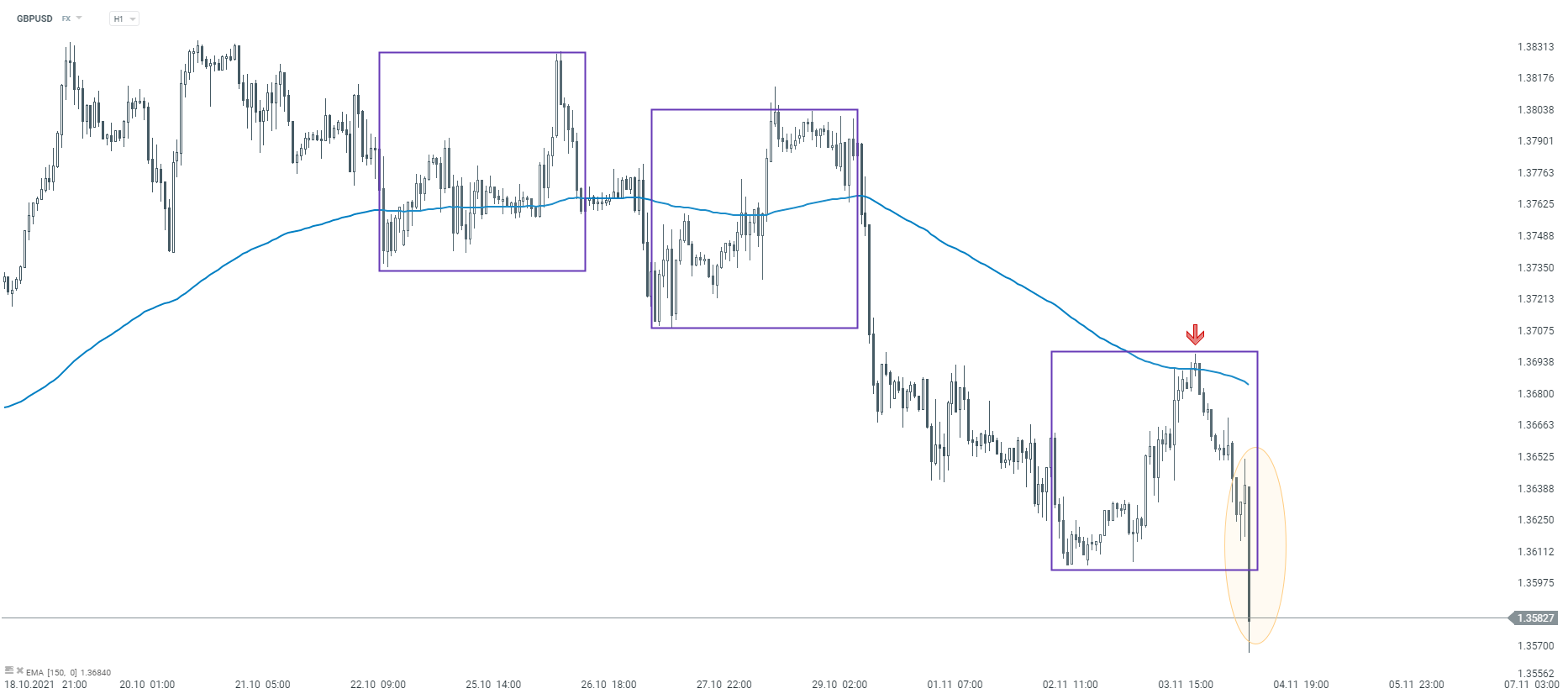 Za scenariuszem spadkowym na GBPUSD mogła przemawiać sytuacja techniczna. Patrząc na interwał H1, notowania odbiły się dziś w nocy od górnego ograniczenia układu 1:1, co z godnie z metodologią Overbalance świadczy o utrzymaniu trendu.