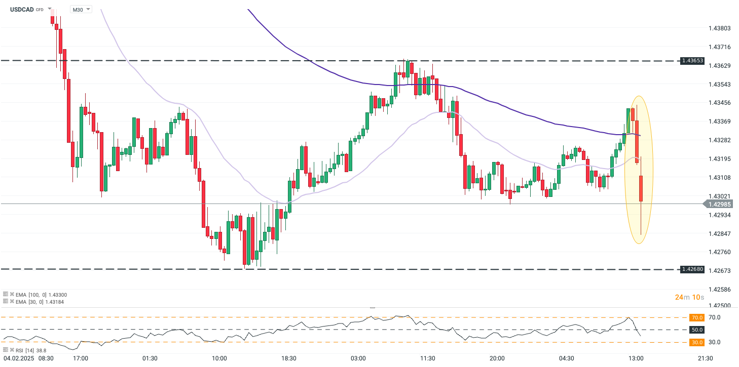 Zatrudnienie w Kanadzie wyraźnie rośnie w obliczu widma odłożonych na 30 dni 25-procentowych ceł Donalda Trumpa. W ciągu ostatnich 3 miesięcy powstało 211 tys. miejsc pracy (najwięcej od początku 2023 roku). Pomimo silnego rynku pracy, USDCAD oddaje część dzisiejszych zysków wraz z wciąż wysokimi oczekiwaniami kolejnych obniżek stóp w Kanadzie, które miałyby pomóc aktywności ekonomicznej w erze nowych barier handlowych.