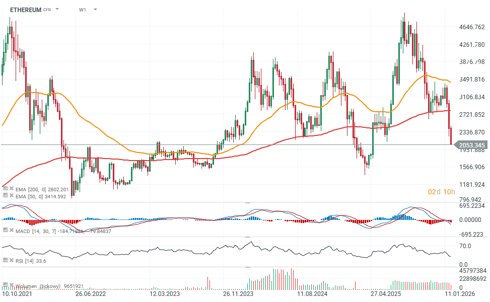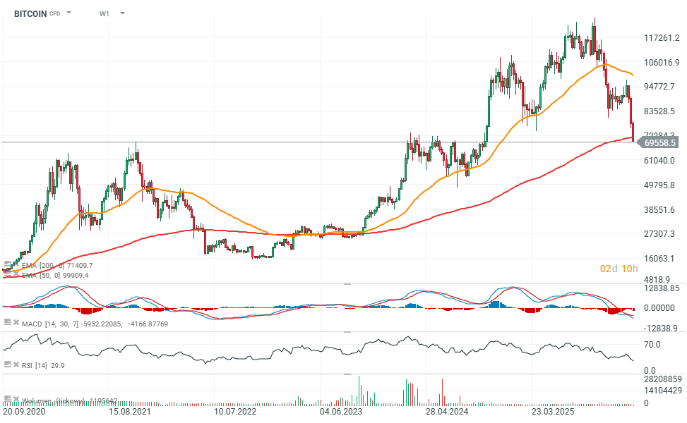 Bitcoin spada 5% poniżej 200-tygodniowej średniej EMA200 (czerwona linia) sygnalizując mniej więcej środkową fazę bessy. Jeśli scenariusz z roku 2022 miałby się powtórzyć, Bitcoina czeka jeszcze jeden spadkowy impuls - prawdopododobnie w kierunku 50 tys. USD. Spadek od szczytów przekracza już 40%.