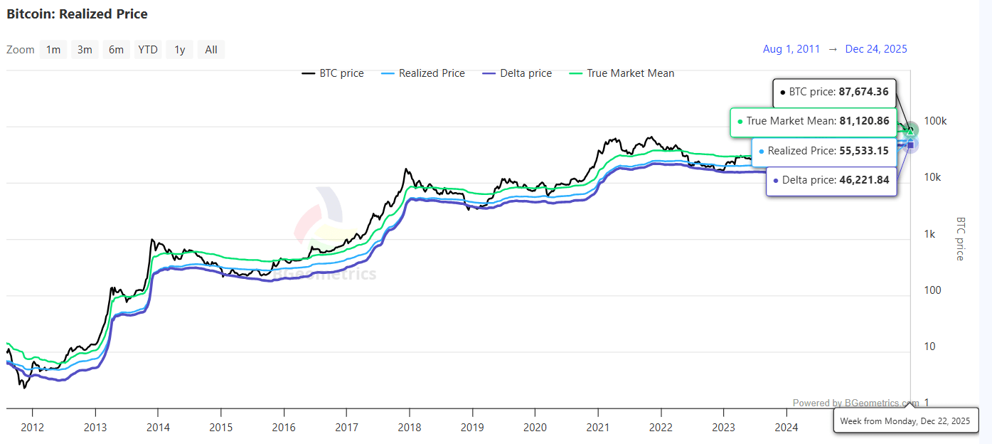 Wydaje się, że w tej fazie bessy możemy sugerować się w pewnym stopniu poprzednim cyklem i niewykluczone, że cena w tym roku ponownie przetestuje okolice tzw. delty ceny on-chain (łączonego wskaźnika 'makro' Bitcoina, bazującego na długoterminowych wsparciach i uśrednionej, zrealizowanej cenie zakupu rynkowej) - w okolicach 45 tys. USD. W dwóch poprzednich bessach poziom delty okazywał się wsparciem 'makro'.