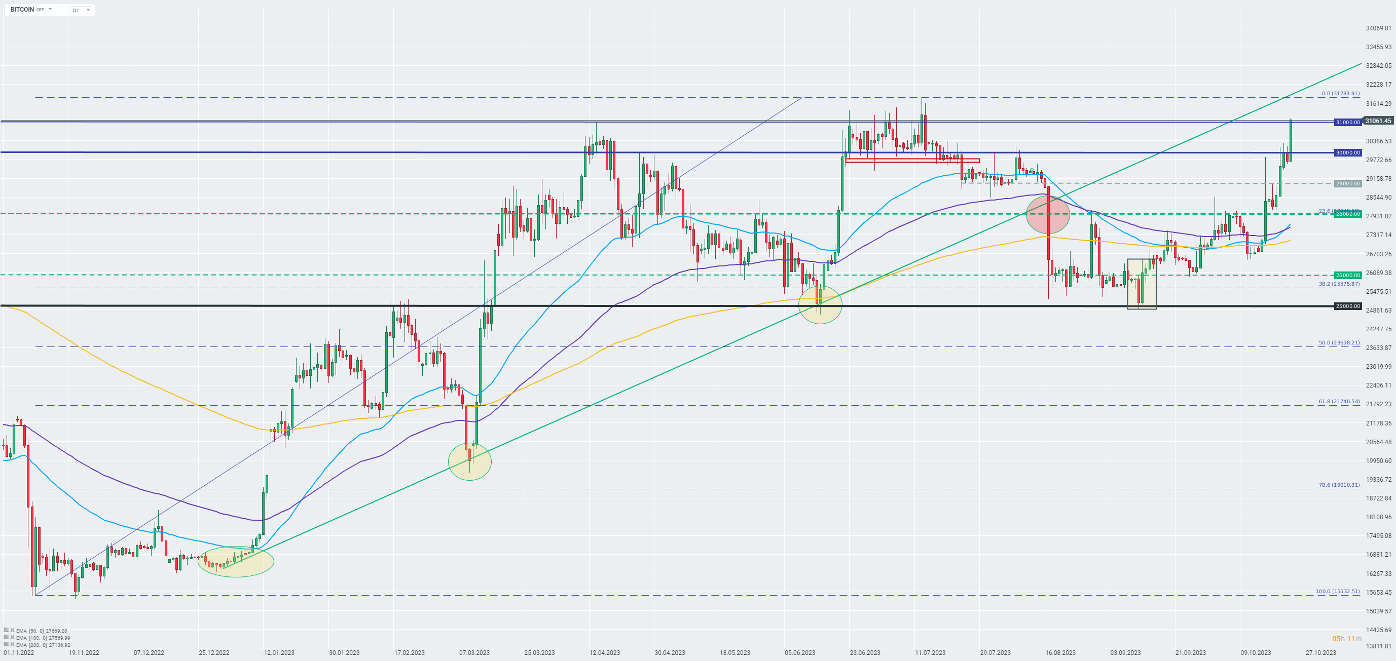 Bitcoin wybił się powyżej poziom 31 000 USD po raz pierwszy od lipca tego roku. Kryptowaluta zyskuje w chwili obecnej ponad 4,6%.