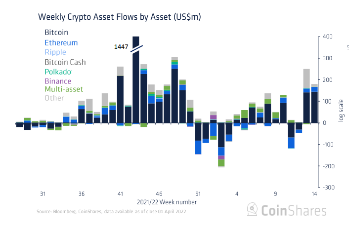 Bitcoin zanotował największy napływ środków w wysokości 144 milionów. Źródło: CoinShares