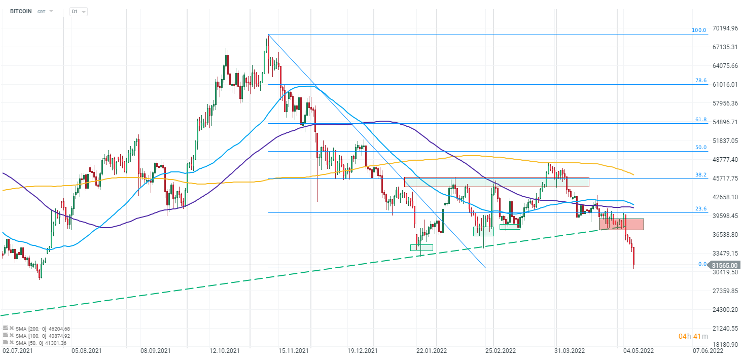 Bitcoin spada do poziomów niewidzianych od drugiej połowy 2021 roku. Największa z kryptowalut spadła chwilowa do 30 900 USD. Źródło: xStation 5