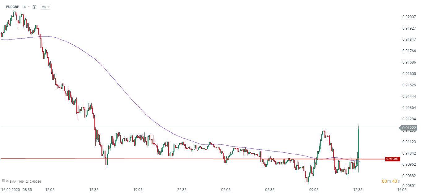 EURGBP wybija się z jednodniowej konsolidacji. Funt traci również w stosunku do dolara. Źródło: xStation5