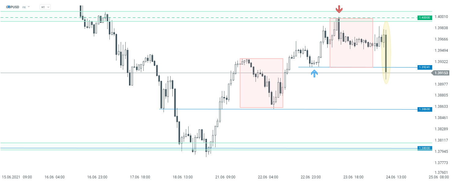 Reakcja na GBPUSD jest dynamiczna, kurs funta zanurkował tuż po godzinie 13:00 na około 60 pipsów. Aktualnie notowania znajdują się nieznacznie poniżej kluczowego krótkoterminowego wsparcia wynikającego z dolnego ograniczenia układu 1:1. Jeżeli momentum spadkowe utrzyma się, możliwy jest atak na wsparcie przy 1,3860, a nawet 1,3800. Oporem pozostaje strefa przy 1,40.