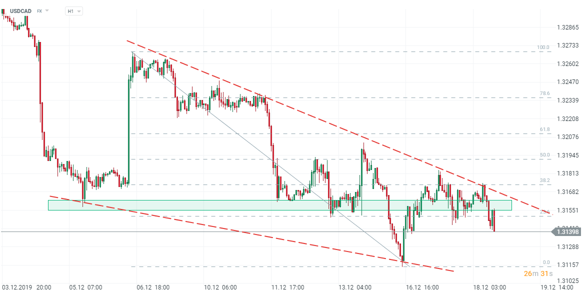 W reakcji na powyższe dane CAD umacnia się w stosunku do dolara. Aktualnie po przetestowaniu ważnej strefy w okolicach 1,3156, kurs zmierza ku dolnemu ograniczeniu kanału spadkowego. Źródło: xStation5