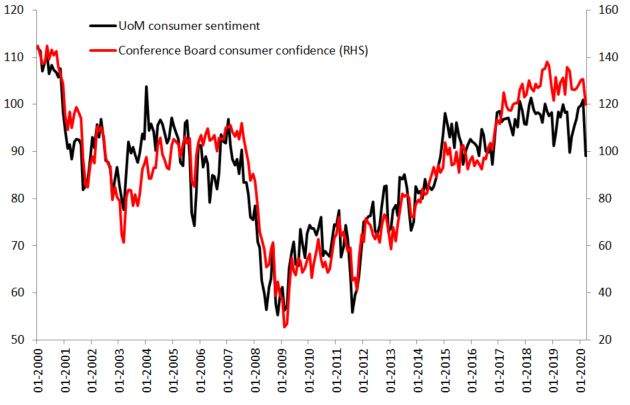 Drugi odczyt to wskaźnik zaufania konsumentów wg Conference Board, który spadł do poziomu 120 punktów (oczekiwania: 110 punktów). Choć jest to dosyć spora obniżka wobec 130,9 punktów w lutym, to tym razem również mamy do czynienia z niespodzianką - wynik nie jest tak negatywny, jak wskazywał na to konsensus rynkowy. Bardzo możliwe, że dopiero kwietniowy odczyt w pełni odda skalę obecnego kryzysu.