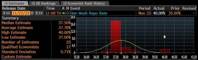 Bank Turcji nieco zaskoczył rynek skalą podwyżki stóp procentowych, które teraz wynoszą 40% (analitycy oczekiwali podwyżki do 37,% względem 35% wcześniej). Lira turecka gwałtownie umocniła się względem USD na krótko po decyzji. Komentarze banku centralnego po decyzji: