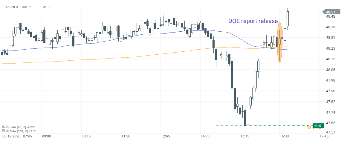 Tuż po publikacji ceny ropy naftowej fluktuowały. Dzisiejszy raport wskazał, że zapasy ropy spadły mocniej niż wskazywał na to konsensus rynkowy, co może być rozpatrywane jako obiecujący znak. Jednakże warto pamiętać, że niektóre rozwinięte gospodarki decydują się na wprowadzanie coraz bardziej dotkliwych restrykcji - jak chociażby Wielka Brytania.