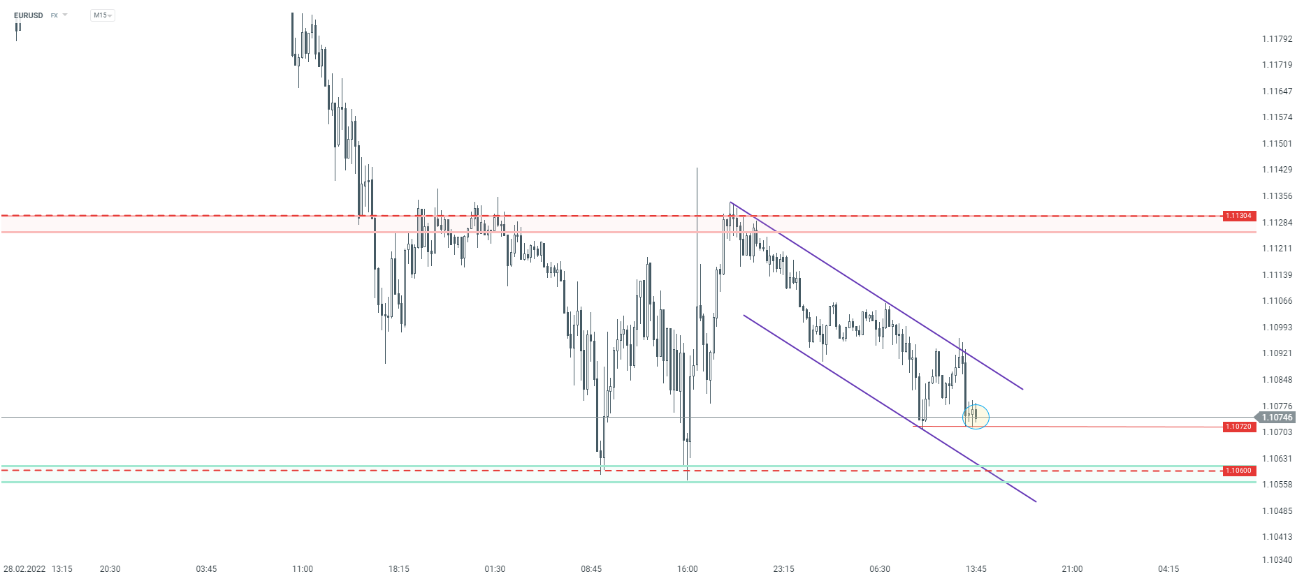 Jeśli chodzi o reakcję rynkową, notowania EURUSD właściwie nie ruszyły się po publikacji. Główna para walutowa pozostaje w tendencji spadkowej. Patrząc na interwał M15, kurs utryzmuje się w lokalnym kanale spadkowym.