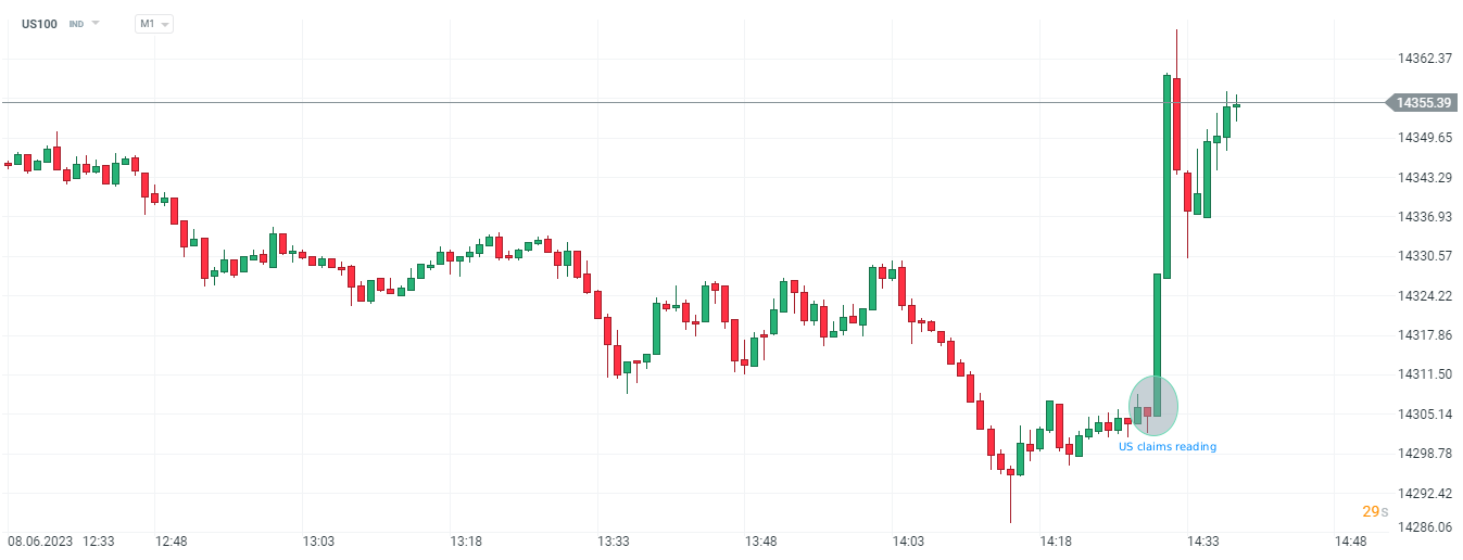 Bardzo duże zaskoczenie wyższym odczytem wniosków o zasiłek może oznaczać, że bezrobotnych w gospodarce dynamicznie przybywa ale jednoczesny spadek wniosków kontynuowanych odzwierciedla wciąż mocne warunki zatrudnienia. Po odczycie rynek upewnił się, że stopy w czerwcu prawdopodobnie nie zostaną podniesione.