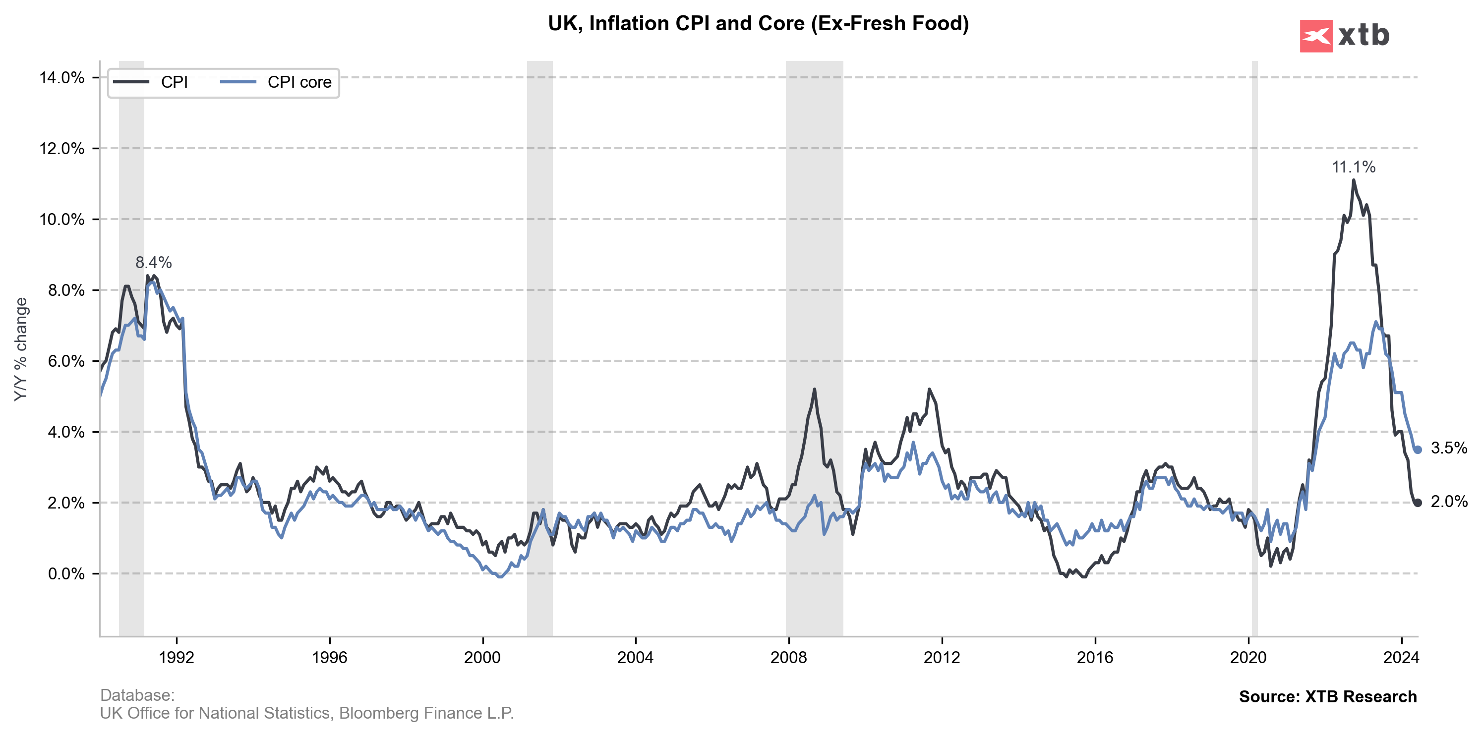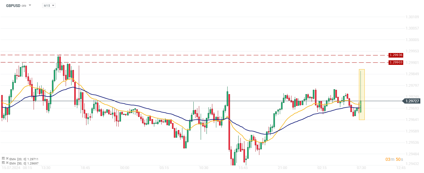 Wyższy odczyt spowodował skokowe umocnienie funta brytyjskiego do dolara, jednak wraz z mijającym czasem reakcja rynku się uspokaja. Nawet wyższy od oczekiwań odczyt pozostawia inflację w celu inflacyjnym, co nie powinno wpłynąć diametralnie na zmianę dotychczasowej polityki BoE. Źródło: xStation