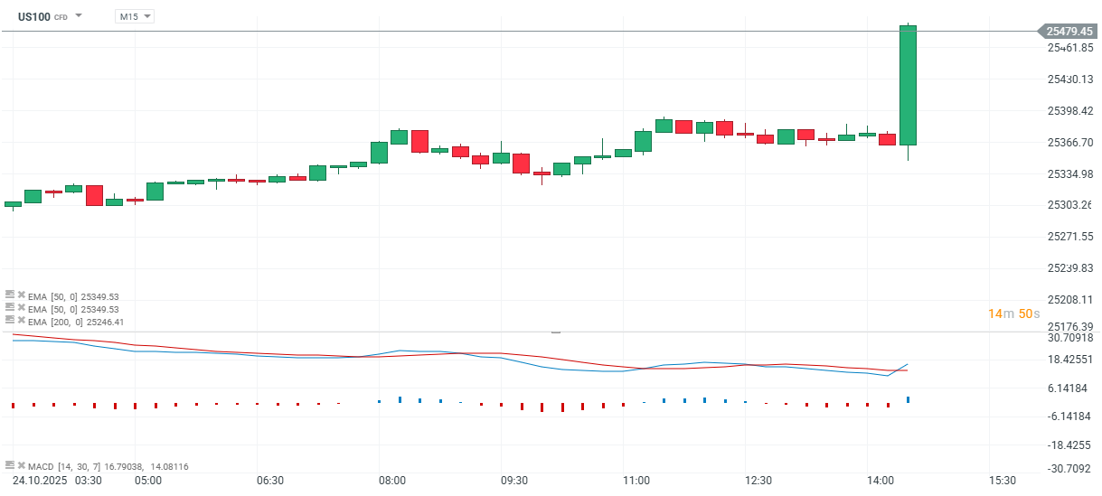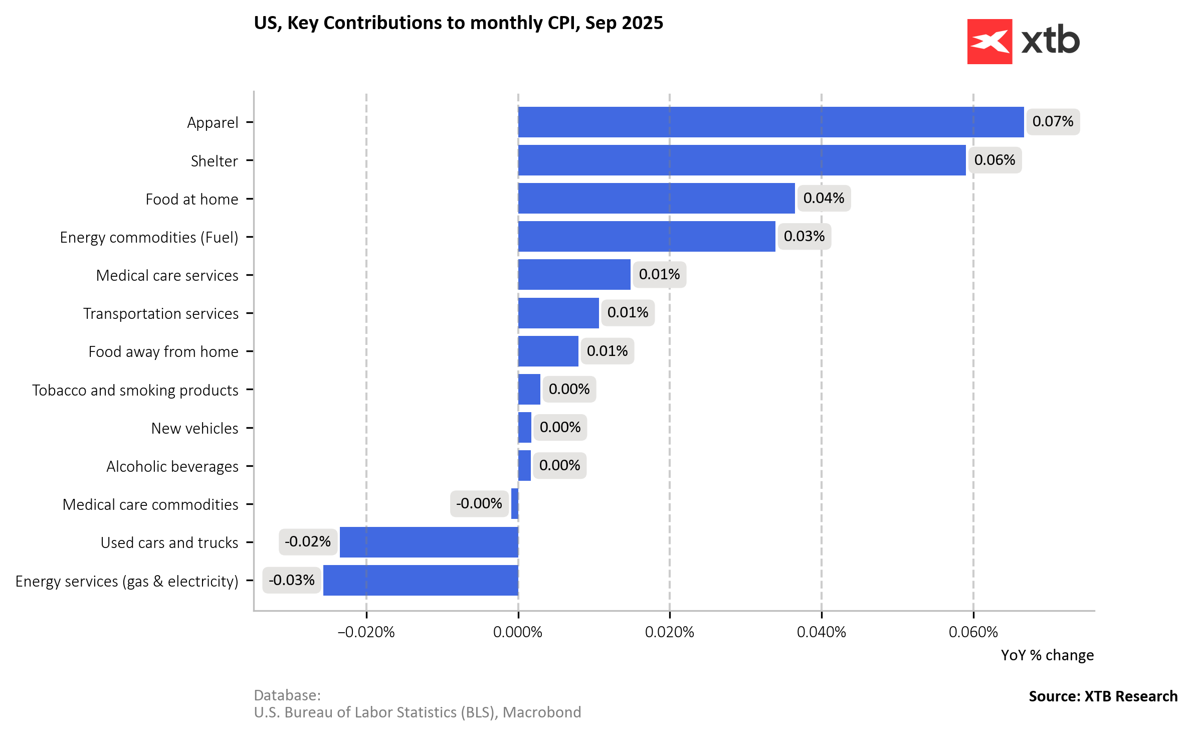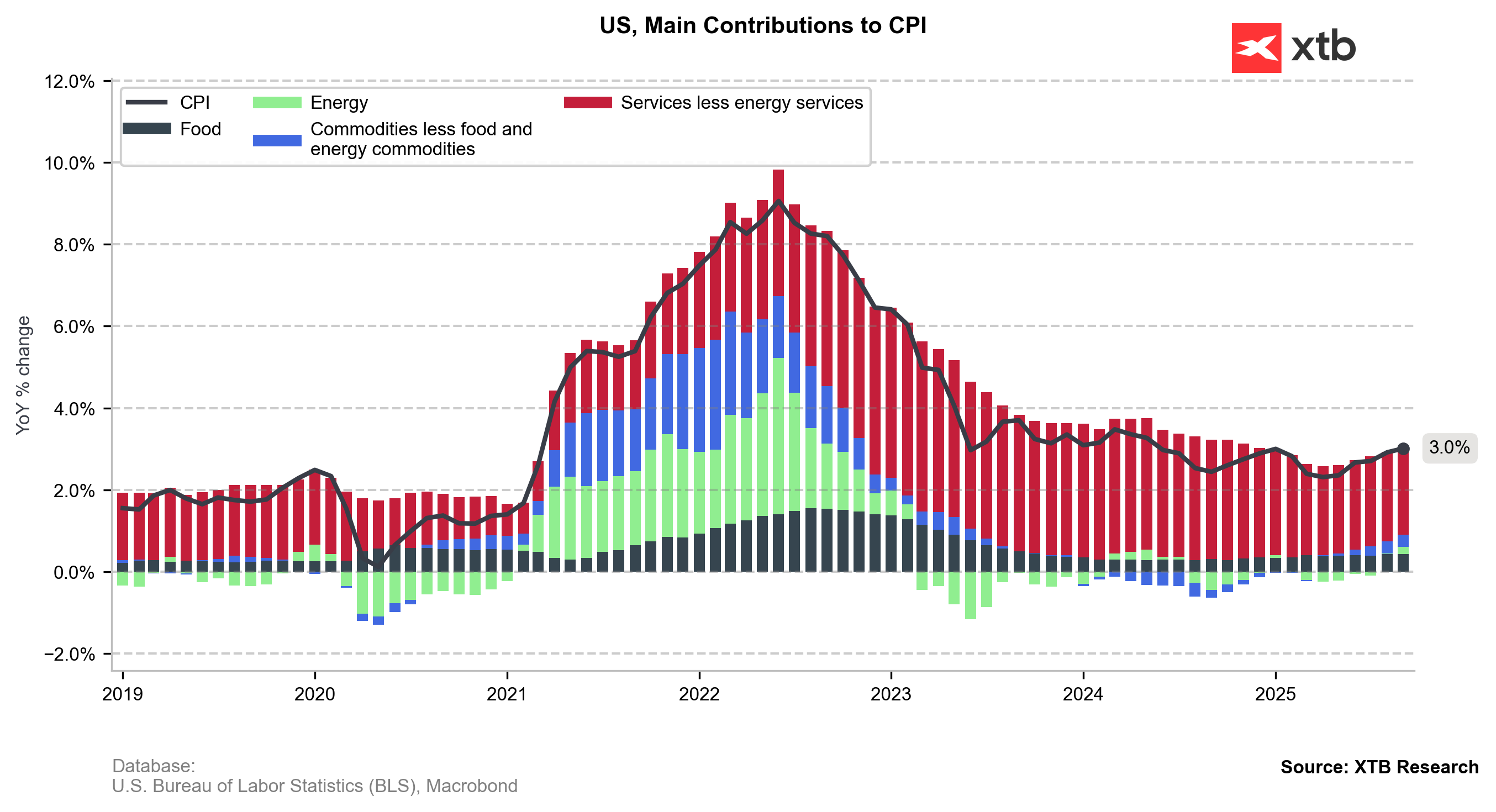 Wrześniowa inflacja CPI z USA wzrosła o 3% r/r wobec 3.1% prognoz i 2.9% poprzednio. Inflacja CPI wzrosła o 0.3% m/n wobec 0.4% prognoz, a bazowa CPI m/m o 0.2% wobec 0.3% oczekiwań. Dane uspokajają rynki co do 'gołębich' decyzji Fed w przyszłości, które rynek widzi teraz jako tym bardziej prawdopodobne. Kontrakt US100 wzrósł w pierwszej reakcji po danych i zbliża się do poziomu 25500 punktów; amerykański dolar osłabił się, a Bitcoin wzrósł powyżej 111 tys. USD. Warto podkreślić jednak, że dane mogą nie być w pełni dokładne, ponieważ zaburza je okres zamknięcia rządu USA.