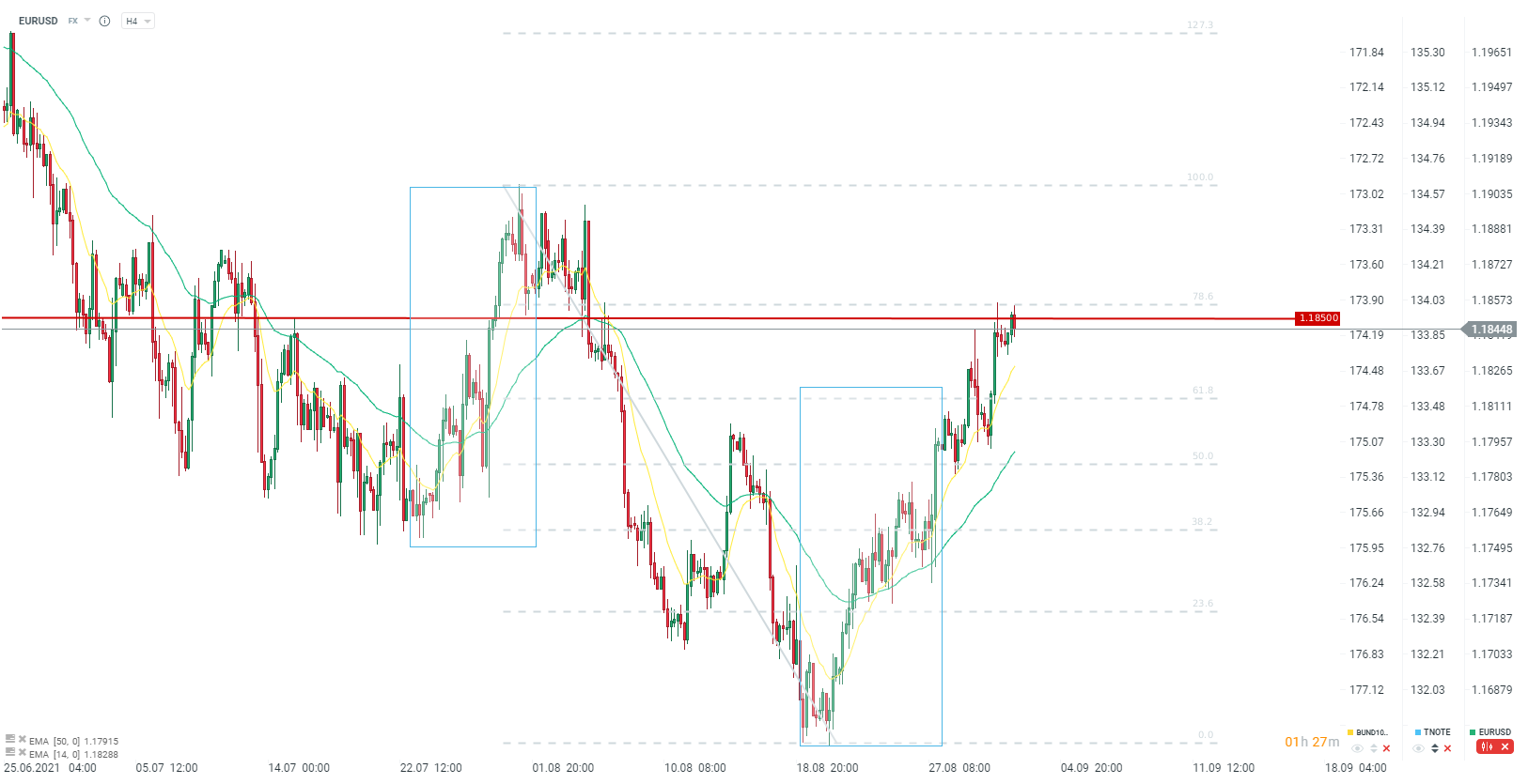 Dolar praktycznie nie reaguje na dane, choć generalnie powinny go raczej wspierać. Widzimy, że przed publikacjami para EURUSD reaguje spadkami na opór w okolicach 1,1850. Źródło: xStation5