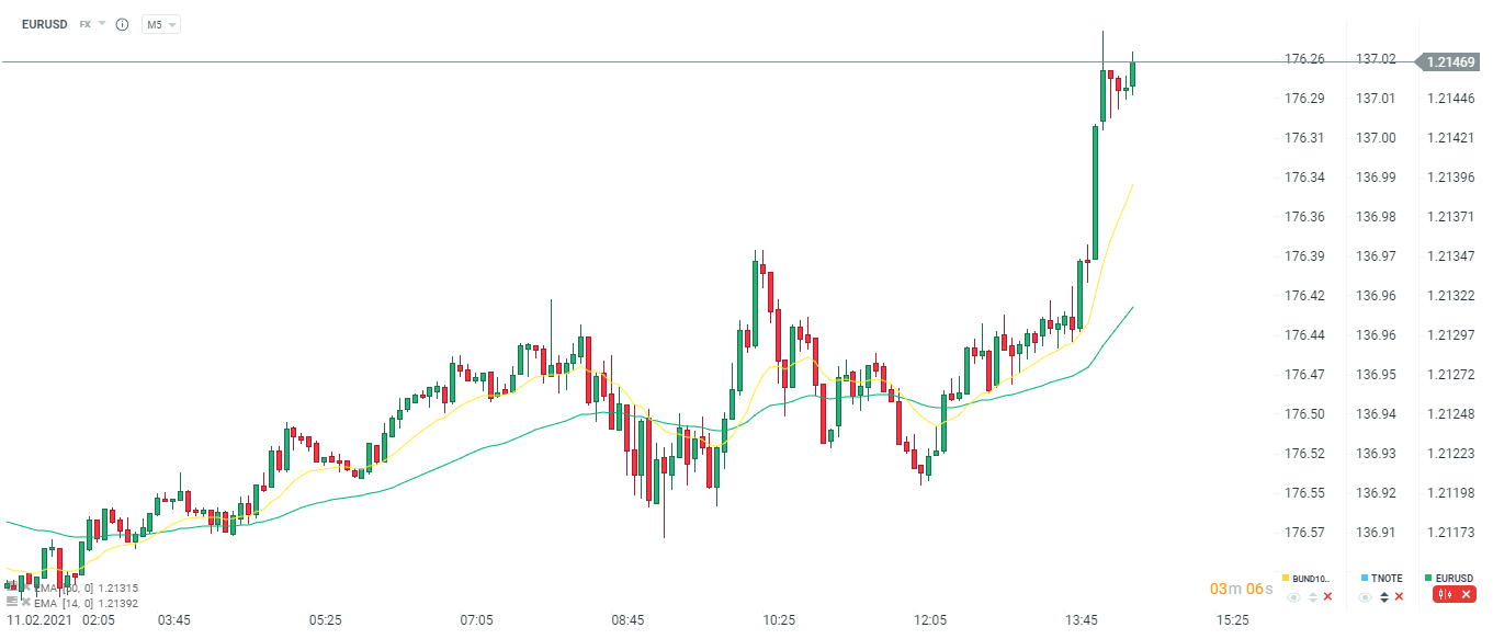 Odczyt bez wpływu na dolara, choć widać, że dolar powraca do strat z poprzednich minut. Para EURUSD już niemal przy 1,2150. Źródło: xStation5