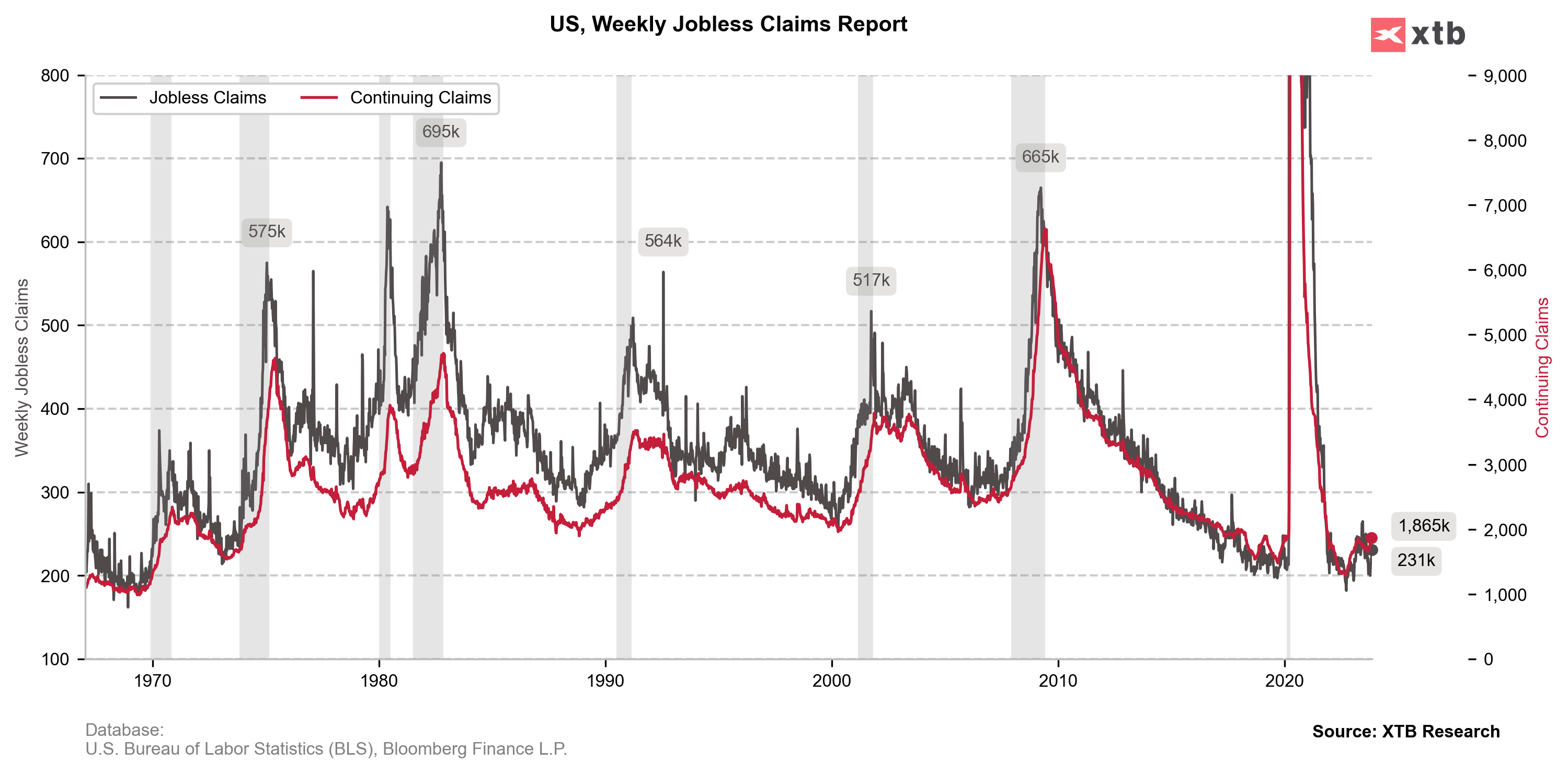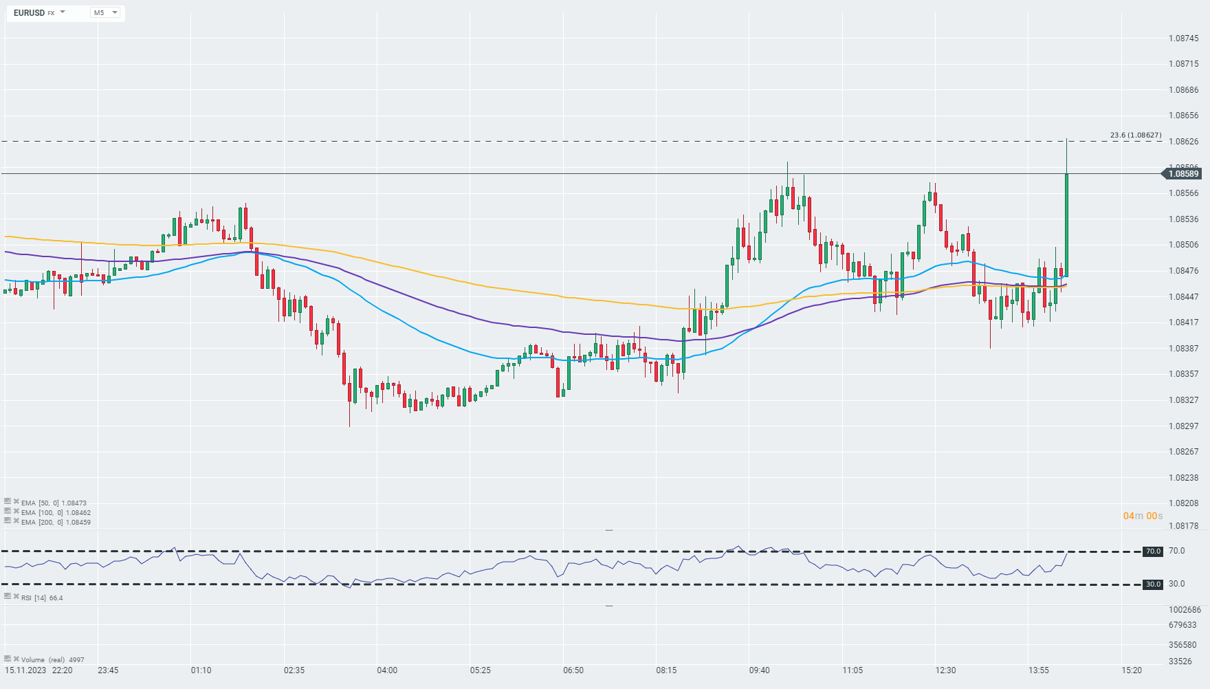 Podczas gdy zarówno liczba nowych bezrobotnych, jak i Philly Fed są uważane za dane drugorzędne, a rynek często patrzy na nie bez znaczącej reakcji, dzisiejszy odczyt był inny. Znacznie wyższa niż oczekiwano liczba nowych bezrobotnych spowodowała osłabienie dolara, a EURUSD osiągnął nowe dzienne maksimum nieco powyżej poziomu 1,0860. Źródło: xStation