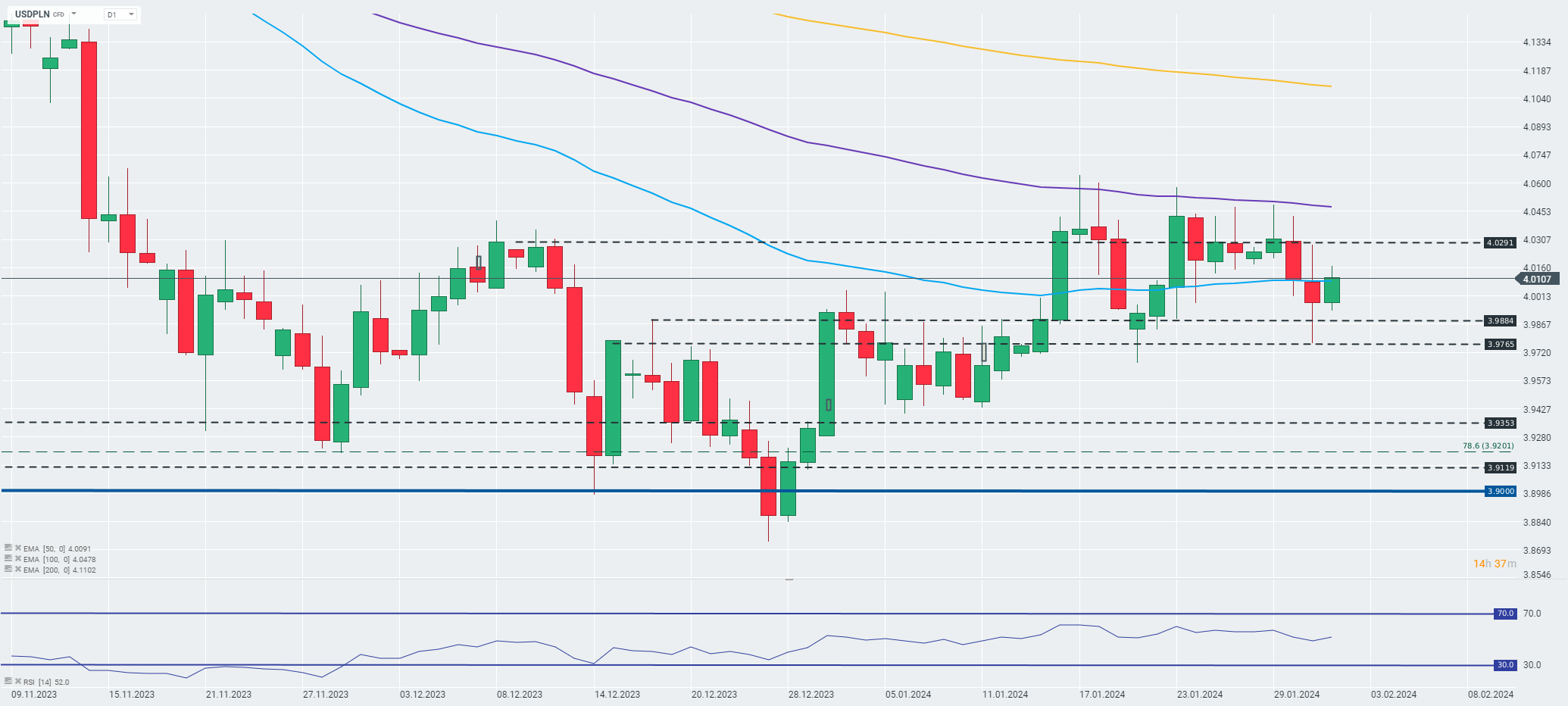 Dolar amerykański zyskuje dzisiaj względem polskiego złotego i wraca powyżej bariery 4.01. Źródło: xStation