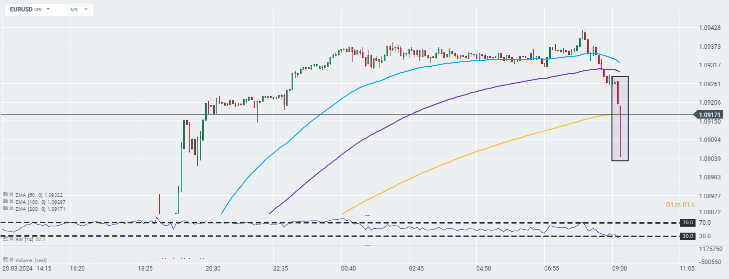 Słabe dane z gospodarki Francji mogą w szerszym terminie wspierać bliższe nadejście obniżek stóp procentowych ze strony EBC. Para EURUSD gwałtownie straciła po odczycie danych.
