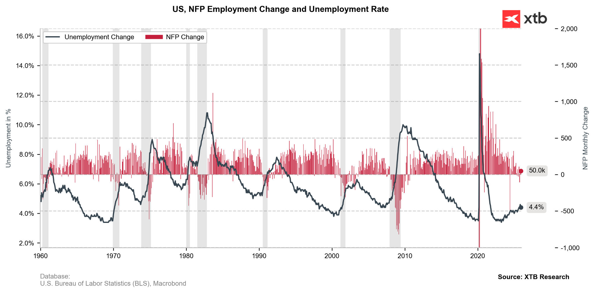 Zmiana zatrudnienia poza rolnictwem (NFP): aktualny odczyt 50 tys. (prognoza 70 tys; poprzednio 64 tys.)