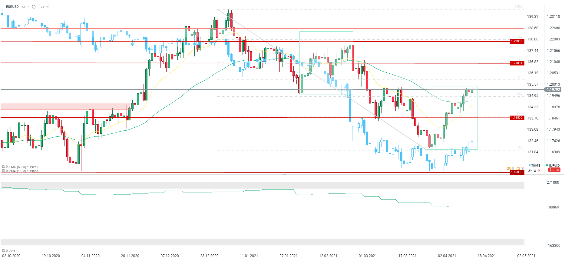 Dolar minimalnie zyskuje po publikacji danych, co prowadzi do obrony limitu struktury overbalance na EURUSD. W przypadku przejścia przez ten opór oraz poziom 1,20, droga do kolejnego oporu w okolicach 1,21 oraz 1,22 pozostanie otwarta. Źródło: xStation5