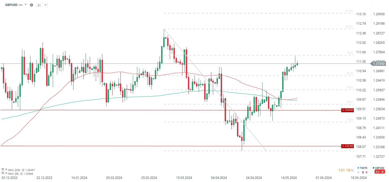GBPUSD kontynuuje ożywienie, które jest wywołane również wczorajszymi danymi inflacyjnymi, które znacznie zmniejszyły szanse na obniżki stóp przez BoE w czerwcu. Powrót PMI przemysłowego powyżej 50 punktów wskazuje na mocniejsze ożywienie w gospodarce.
