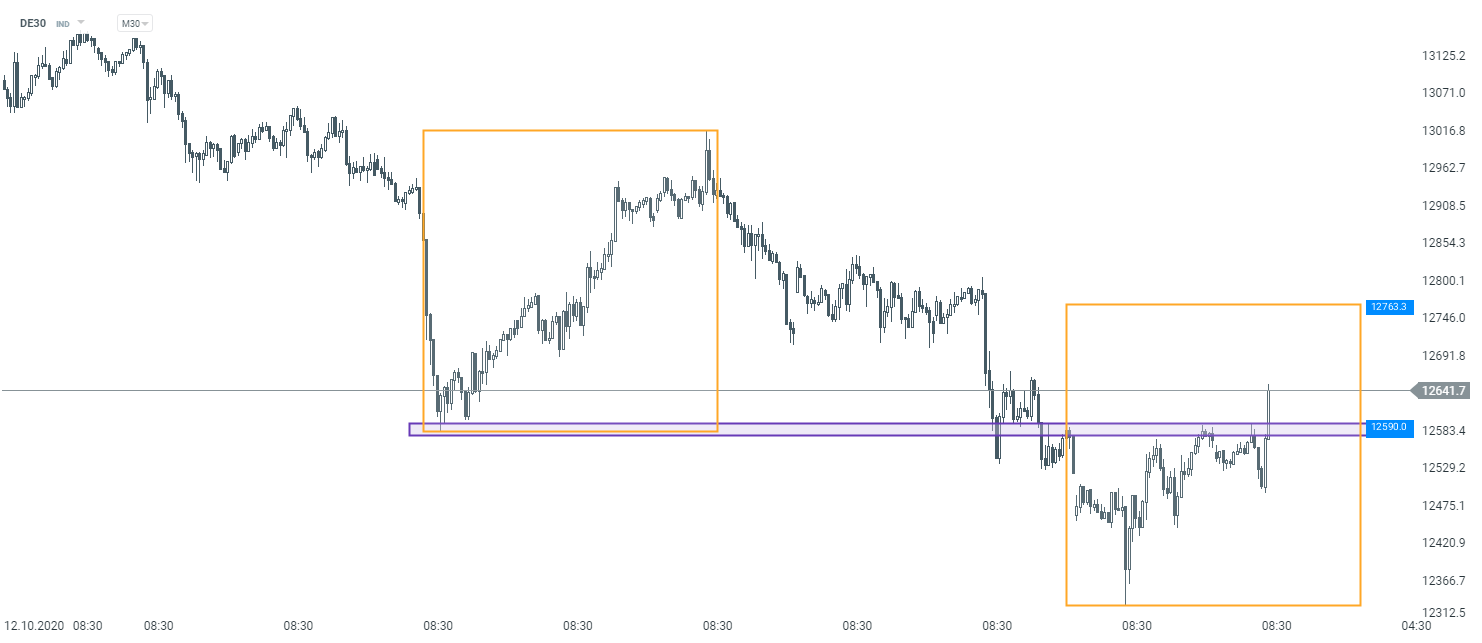 Reakcja rynków jest pozytywna, indeksy w Europie, w tym DE30 ruszył ymocno w górę tuż po publikacji. Patrząc na wykres M30, na niemieckim indeksie doszło do pokonania strefy oporowej przy 12590 pkt, co otwiera drogę w kierunku 12760 pkt.