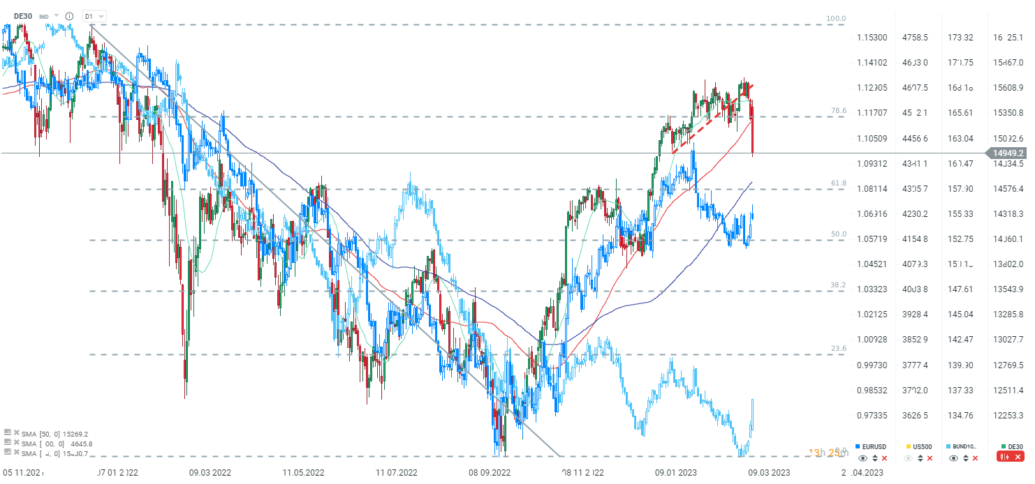 DE30 spada poniżej 15 tys. punktów oraz jest notowany najniżej od 11 stycznia! Strata na DE30 sięga już ponad 2%. Jeśli DAX szybko nie wróci powyżej 50 okresowej średniej, to kolejne wsparcie znajduje się nieco powyżej 14500 punktów, gdzie widać było wcześniejsze reakcje cenowe. Jednocześnie trwa domykanie dywergencji z EURUSD, czy zmniejszanie potężnego rozdzwięku między DAXem a Bundami.