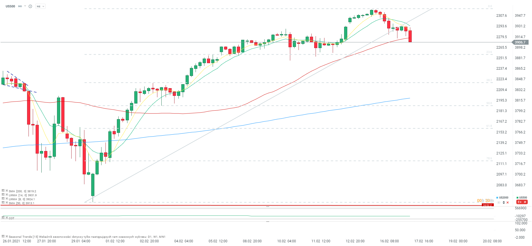 Dobre dane, nie mówiące jednak o możliwym wybuchu inflacji nie umacniają kontraktów na Wall Street. US500 blisko 3900 punktów. Kluczowe wsparcie przy zniesieniu 23.6. Źródło: xStation5