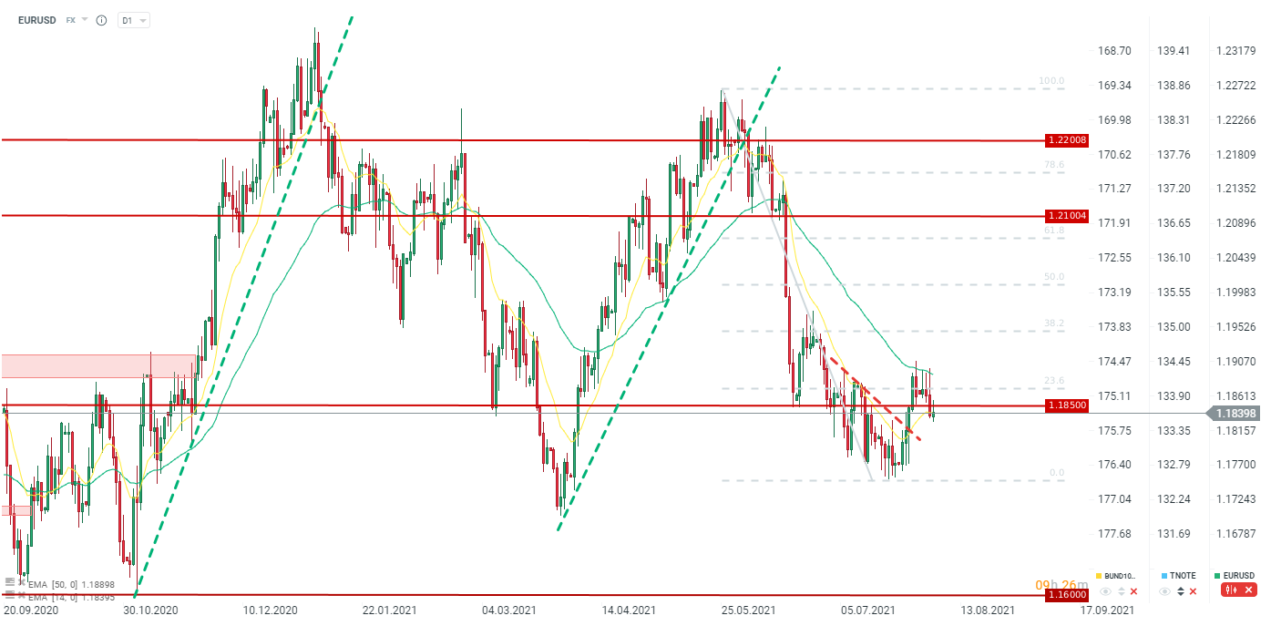 EURUSD ogranicza wzrosty z wcześniejszej fazy sesji, cofając się ponownie poniżej 1,1850. Źródło: xStation5