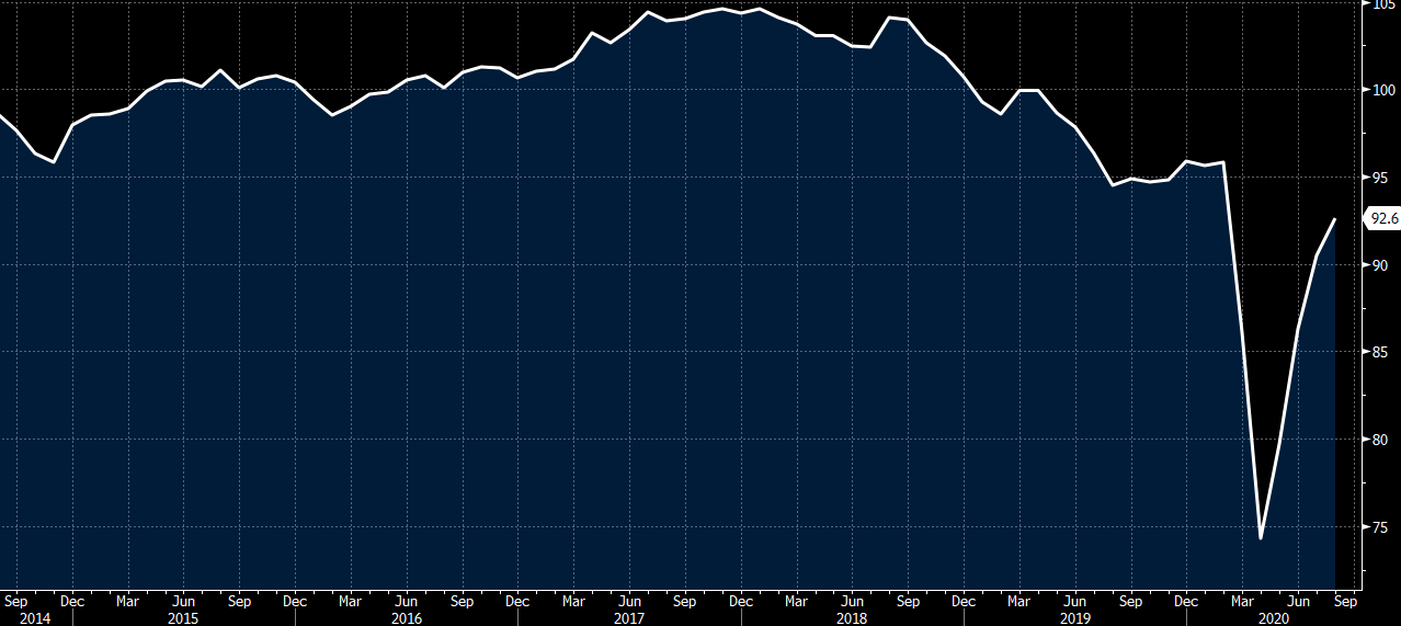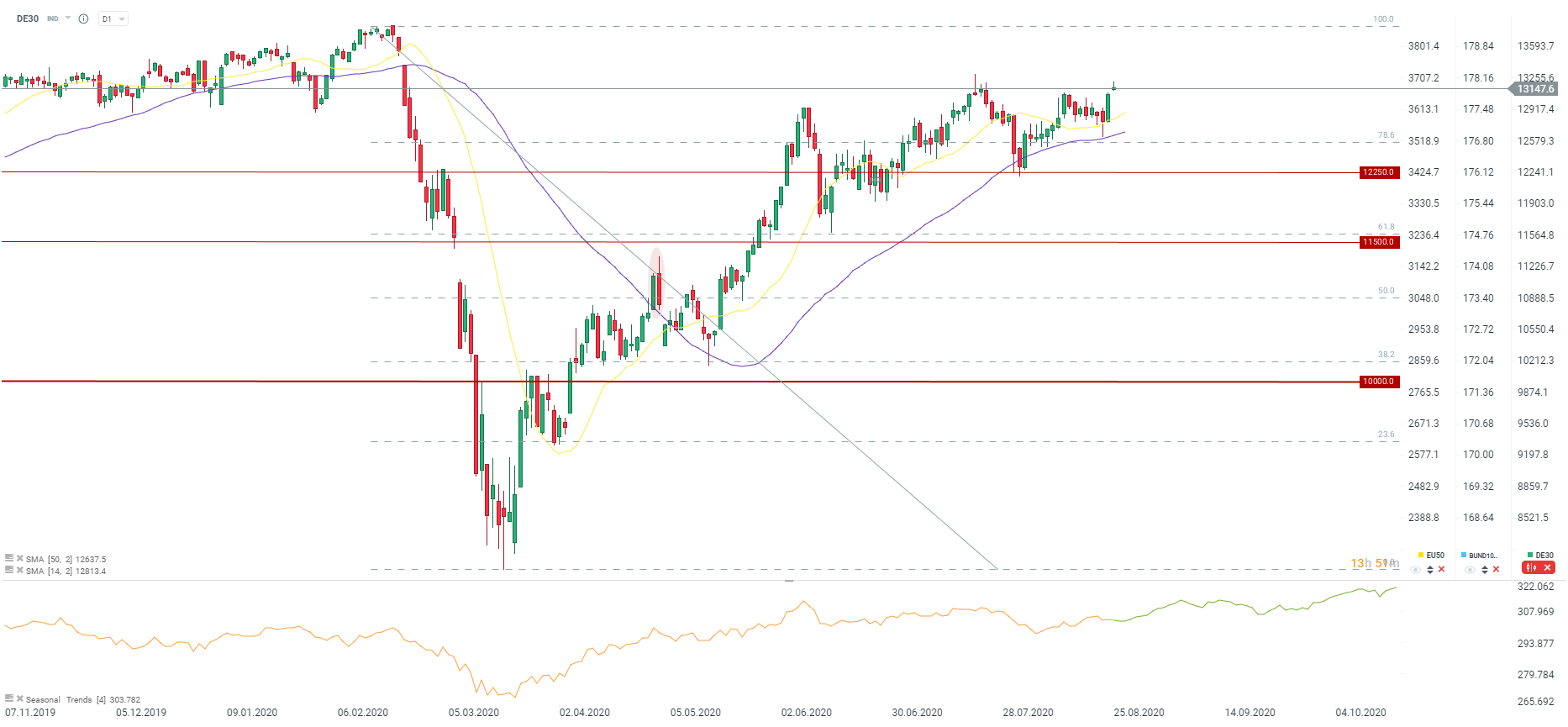 Przed momentem poznaliśmy ostatnie ważniejsze dane z sesji europejskiej. Indeks Ifo wypadł na poziomie 92,6 punktów za sierpień przy oczekiwaniu wzrostu do 92,2 punktów z poziomu 90,4 punktów. Bieżąca sytuacja została oceniona lepiej od oczekiwań na poziomie 87,9 punktów przy oczekiwaniu 87 punktów oraz przy poprzednim poziomie 84,5 punkta. Z kolei oczekiwania dotyczące przyszłości zaliczyły wzrost, ale mniejszy od oczekiwań. Poziom za sierpień to 97,5 punktu przy oczekiwaniu 98 oraz poprzednim poziomie 97,7 punktu. Jest to dobry odczyt, biorąc pod uwagę stagnację w odbiciu indeksów PMI.
