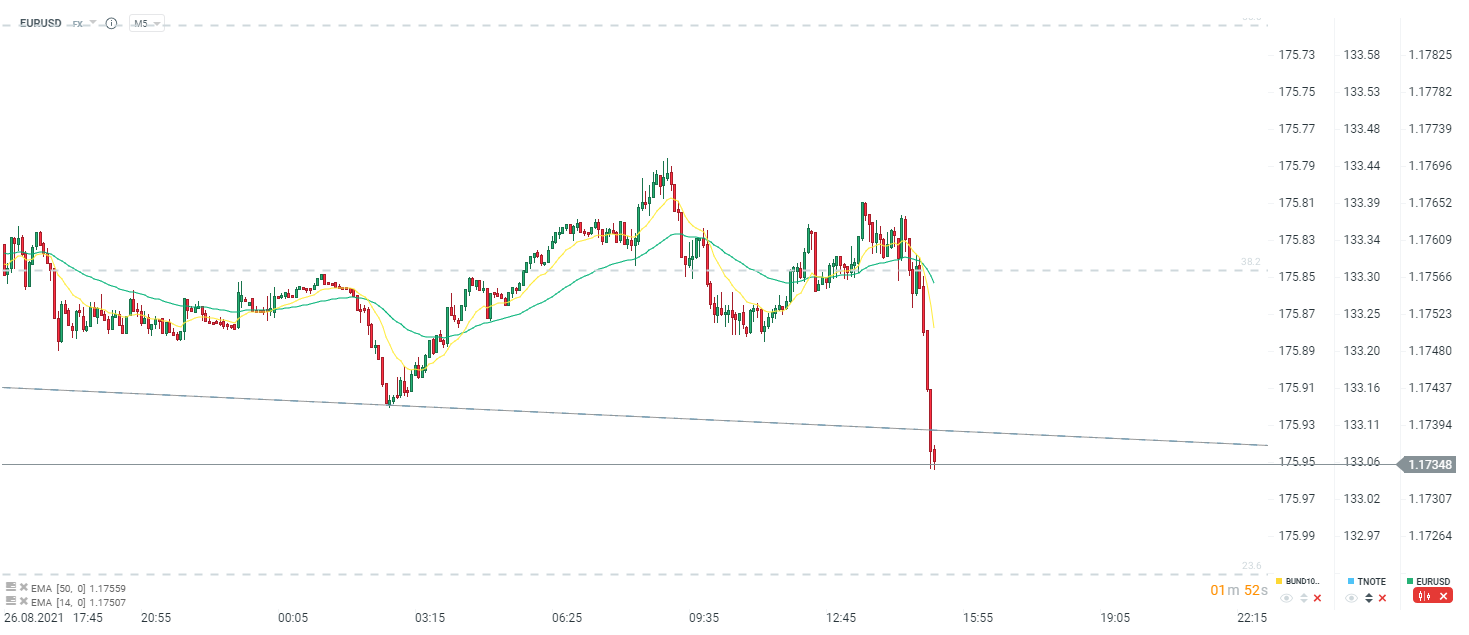 Wyraźne umocnienie dolara po komentarzach Mester. Jej zdaniem gospodarka poczyniła znaczące postępy i chciałaby rozpoczęcia taperingu w przyszłym roku. Mester nie jest częścią głosującą FOMC w tym roku, ale jest w przyszłym. Ważne jest również to, że Mester kradnie trochę show bankierom z Jackson Hole, gdyż udziela ona wywiadu w CNBC. Oprócz niej w Bloomberg TV wypowiada się Harker, choć zdecydowanie mniej jastrzębio, wskazując na ryzyka powiązane z koronawirusem.
