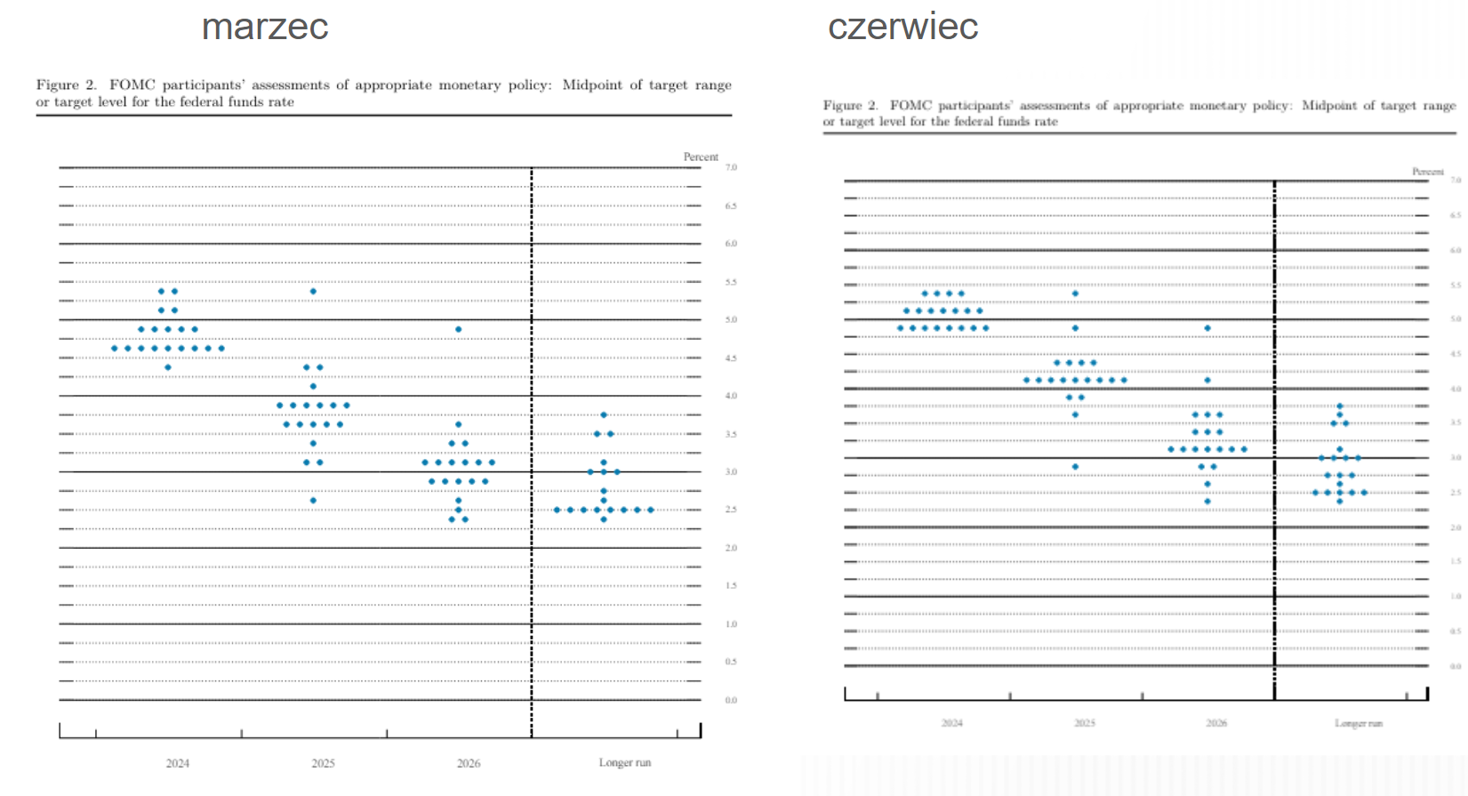 Wykres dot plot wypada nieco bardziej jastrzębio. Bankierzy spodziewają się jednej obniżki o 25 pb; w marcu szacowano 3 takie obniżki (analitycy oczekiwali 2 obniżek). Źródło: FED