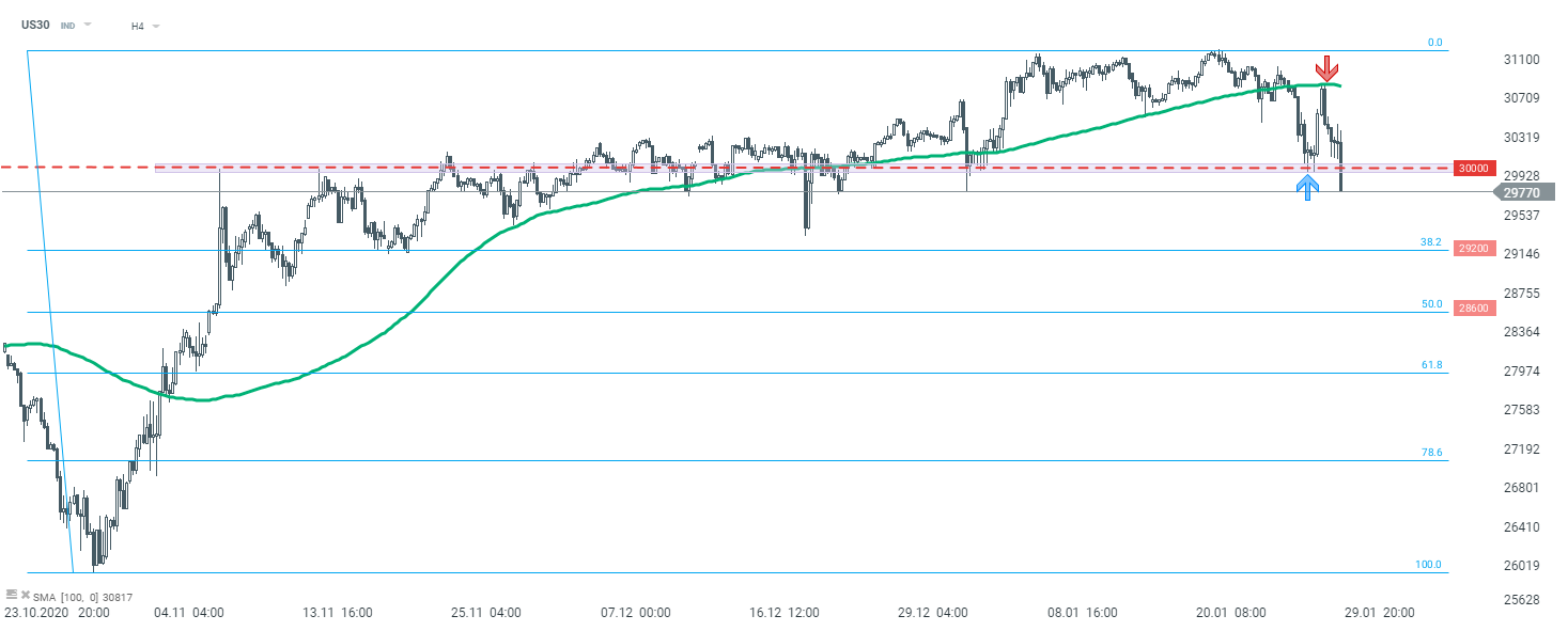 Indeks Dow Jones (US30) nie był w stanie wrócić wczoraj powyżej 100 okresowej średniej kroczącej (zielona linia), gdzie ponownie pojawili się sprzedający. Aktualnie indeks wybił się również poniżej lokalnych dołków przy okrągłym poziomie 30 000 tysięcy punktów, który stanowił kluczowe wsparcie, dlatego też niewykluczona jest dalsza wyprzedaż. Najbliższe warte uwagi wsparcie znajduje się dopiero przy mierzeniu 38,2% Fibonacciego, które zostało wyznaczone na ostatniej fali wzrostowej (licząc od początku listopada).