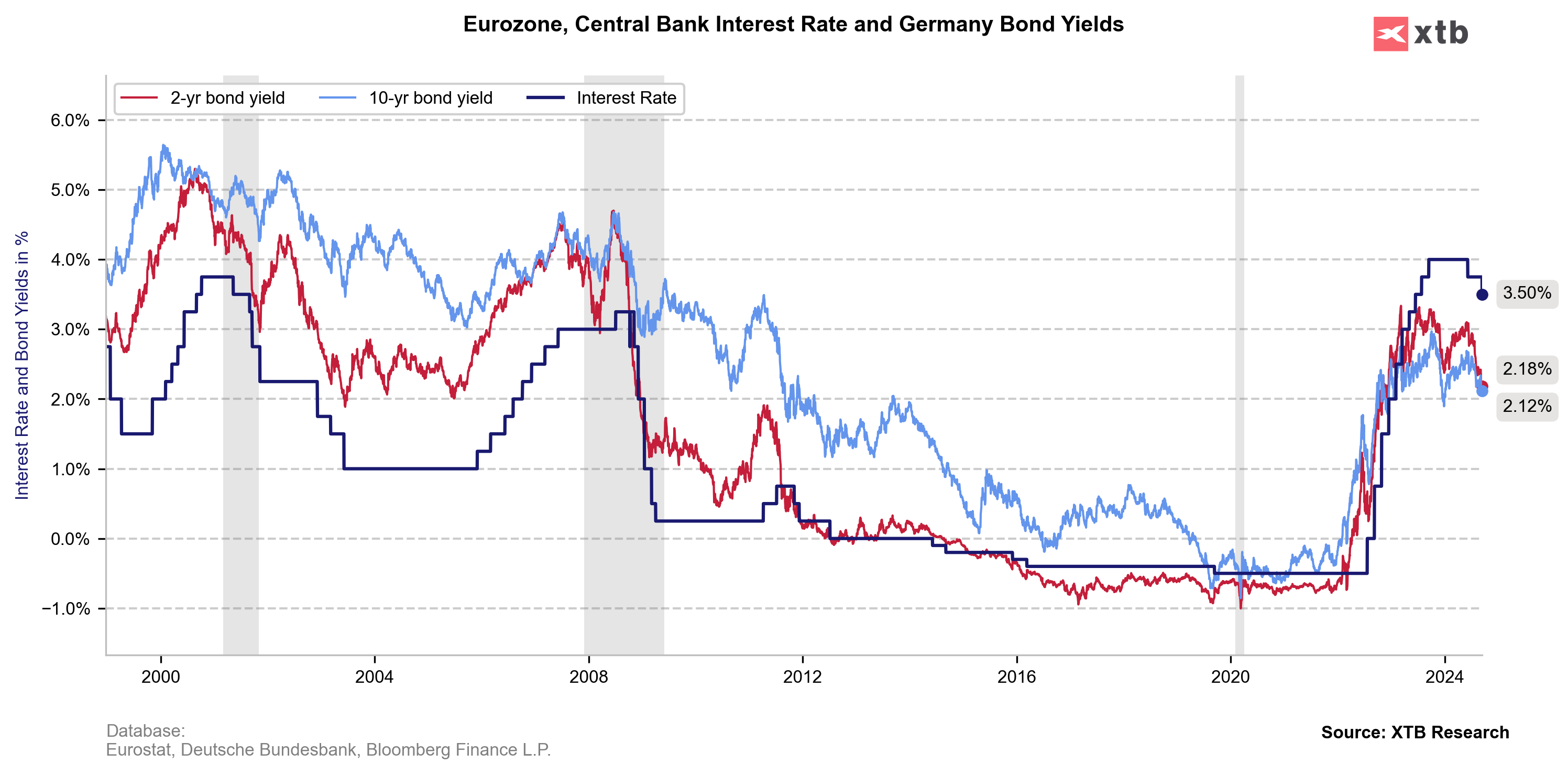 Rynek pieniężny po decyzji EBC obniżył swoje oczekiwania odnośnie kolejnych obniżek procentowych. Przed decyzją wyceniał 43 pb obniżki, a obecnie spodziewa się 36 pb.
