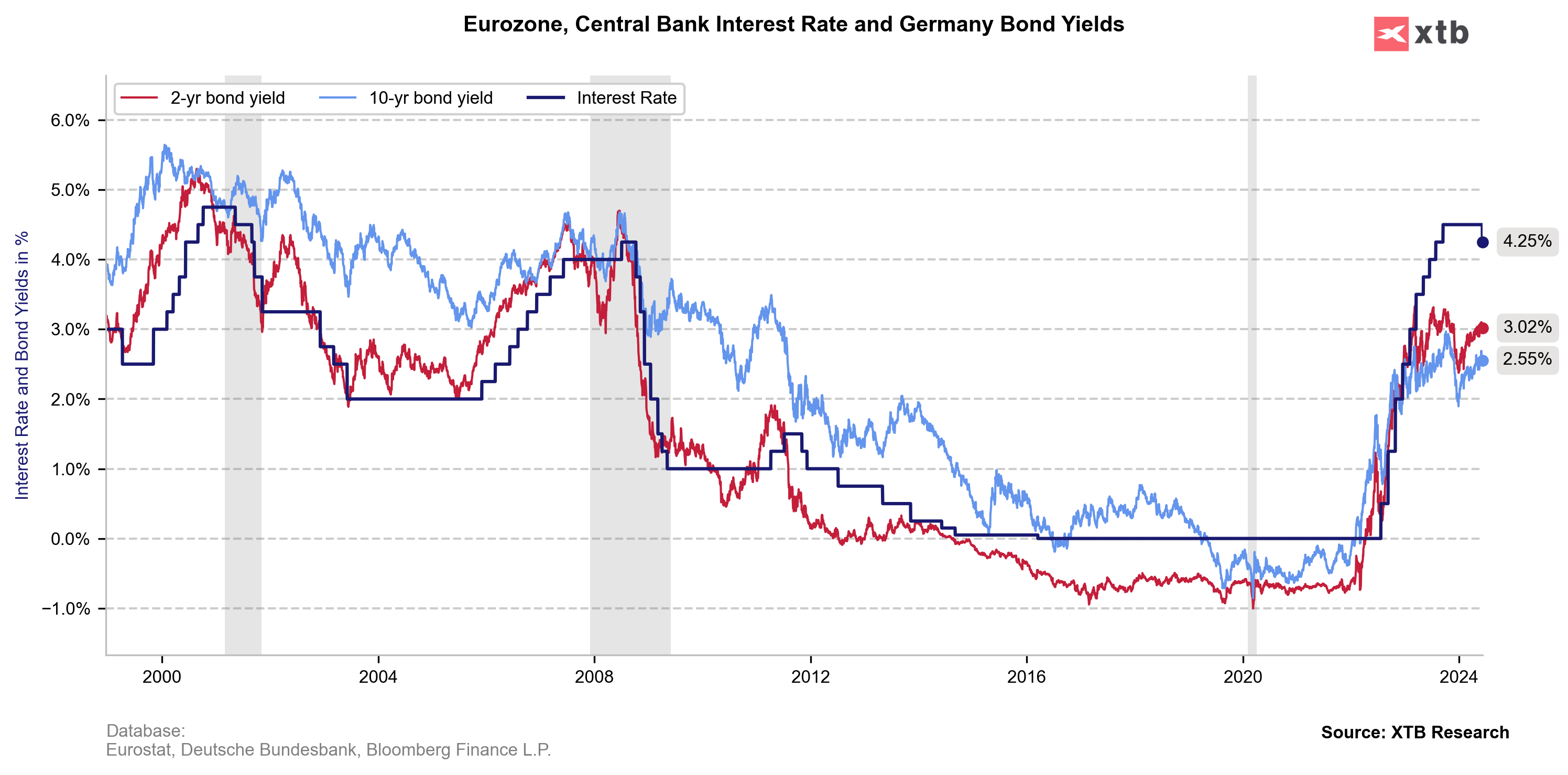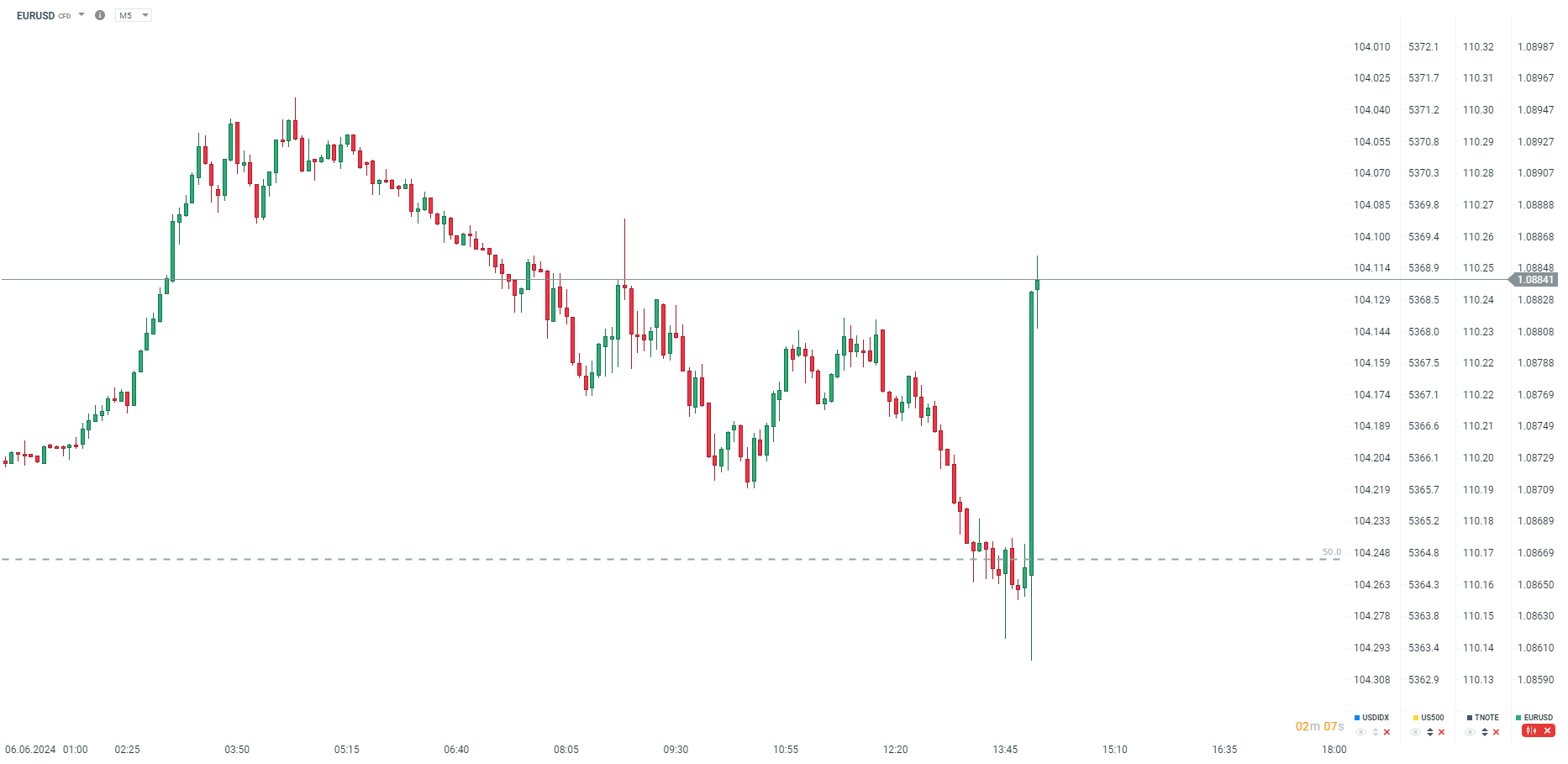 EBC wskazuje również, że nie zobowiązuje się do żadnej ścieżki dotyczącej dalszych obniżek stóp procentowych. Brak sygnału dla potencjalnego lipcowego ruchu jest odbierany jastrzębio. Dodatkowo EBC podkreśla, że dzisiejsza obniżka jest krokiem w kierunku zmniejszenia restrykcyjności, ale nie krokiem w kierunku normalizacji.