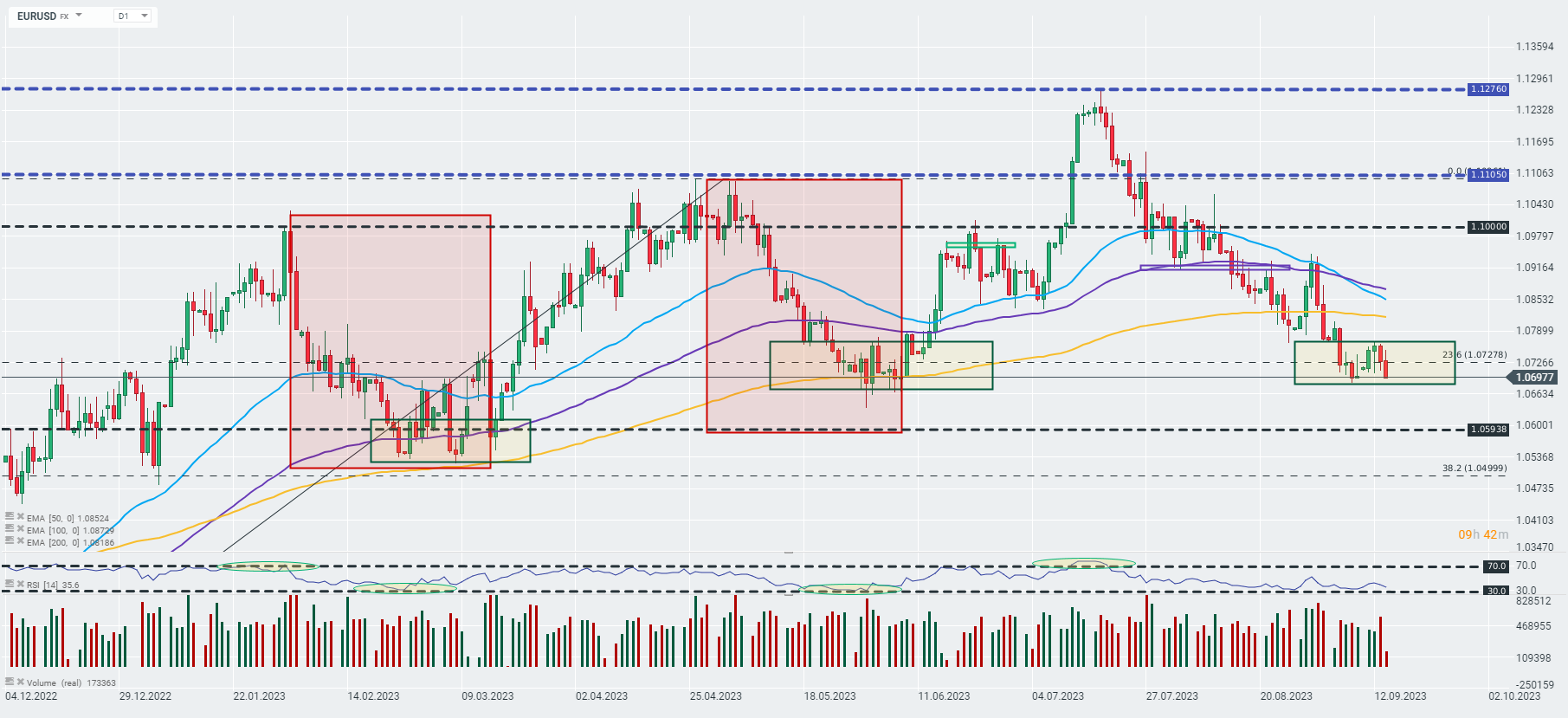 Mimo zaskakującej decyzji EBC o podniesieniu stóp o 25 punktów bazowych, para EURUSD wyraźnie się osłabia i wybija się poniżej bariery 1,07! Ma to przede wszystkim związek z prawdopodobnym zakończeniu cyklu podwyżek przez EBC.