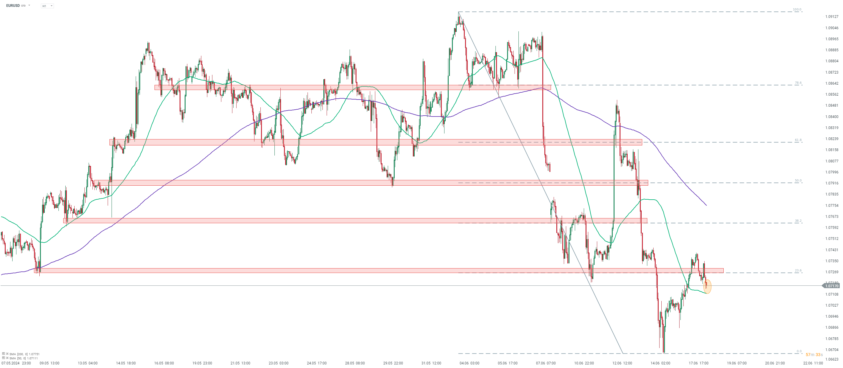 Faktyczne dane ZEW rozczarowały - wskaźnik oczekiwań poprawił się w porównaniu z majem tylko nieznacznie, natomiast wskaźnik sytuacji bieżącej się pogorszył. Ostateczne dane wskaźnika CPI ze strefy euro wypadły zgodnie z oczekiwaniami, tak jak podczas wstępnego odczytu. Euro zareagowało natychmiastowym spadkiem, ale ta reakcja była krótkotrwała i kurs EURUSD jest praktycznie bez zmian w porównaniu do poziomów sprzed publikacji.