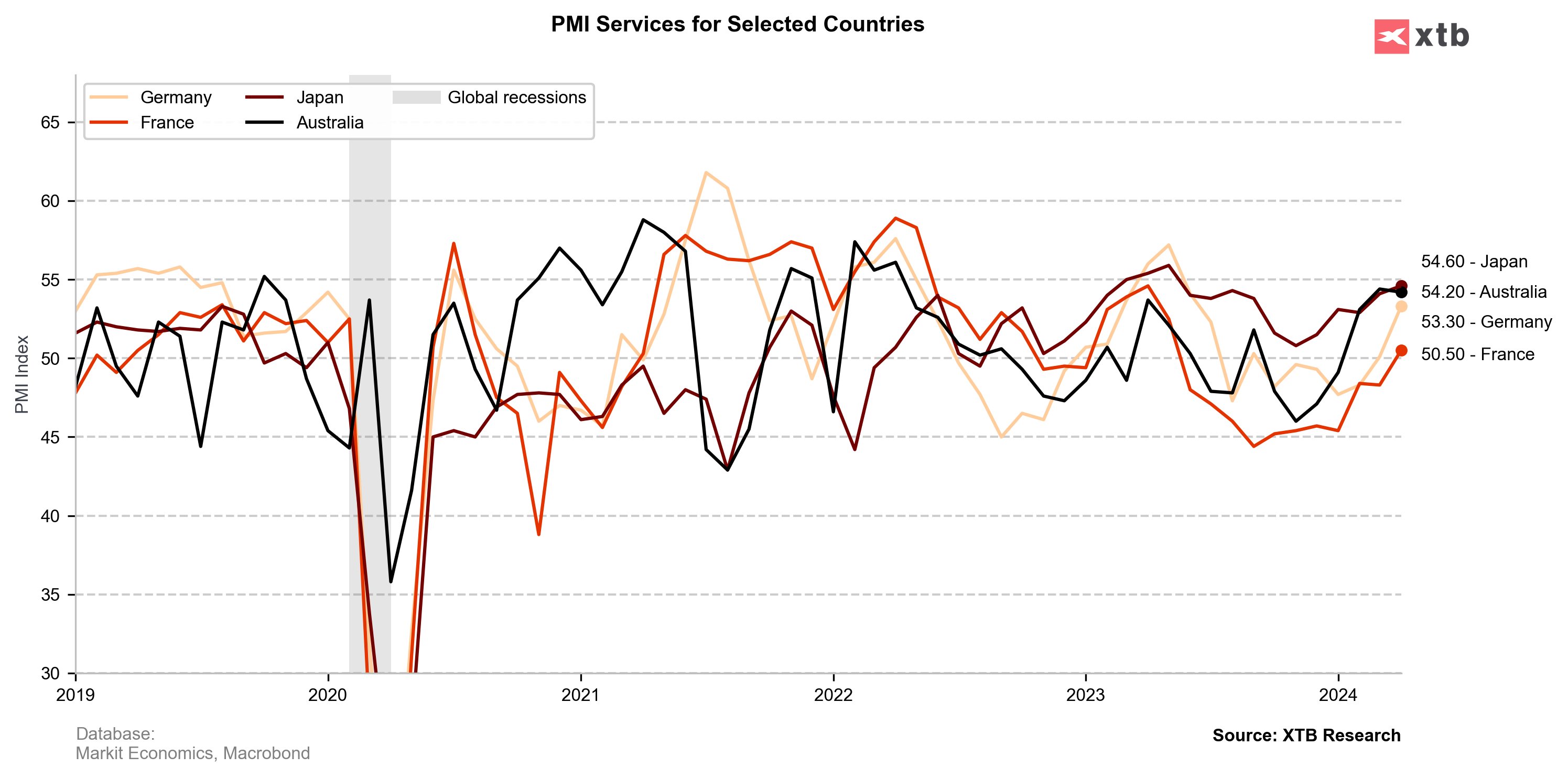 Dzisiejsze raport PMI wypadają bardzo jastrzębio. Sporo zaskoczenie w górę jeśli chodzi o odczyty usługowe, wzmacniają narracje, że na szybkie cięcia stóp w strefie euro może być za szybko.