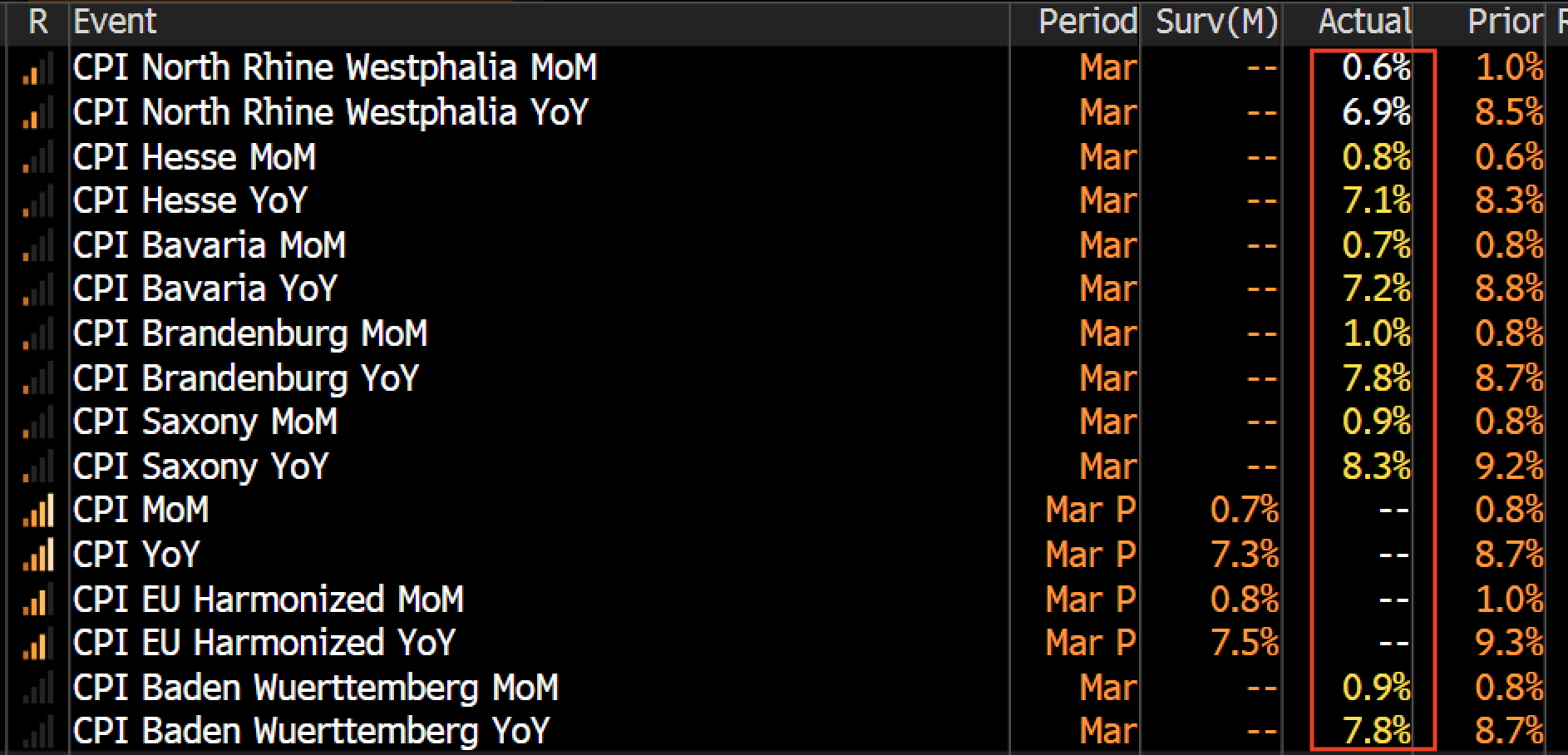 Niemcy, wstępny odczyt inflacji CPI za marzec. Obecnie: 7.4% r/r. Oczekiwane: 7.3% r/r. Poprzednio: 8.7% r/r