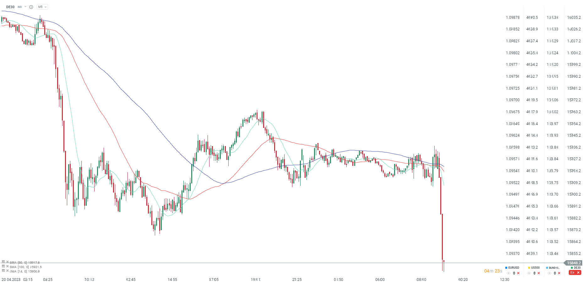 DE30 wyraźnie zniżkuje po danych i spada poniżej 15900 punktów. Źródło: xStation5