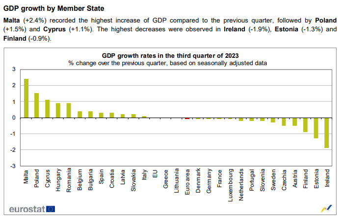 Wśród państw członkowskich Unii Europejskiej największy wzrost kwartalny PKB odnotowały Malta oraz Polska. Największe spadki odnotowały Irlandia oraz Estonia.