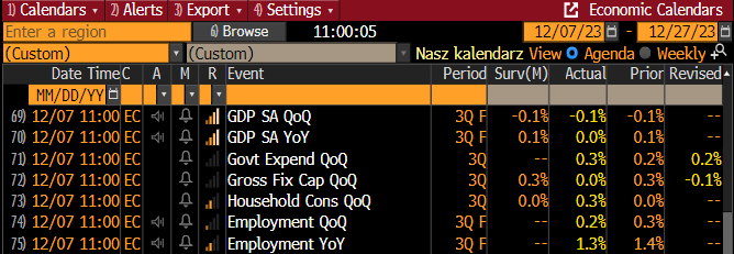 - Strefa euro, raport o PKB za 3. kwartał 2023 r. (rewizja). Obecnie: -0,1% m/m. Druga publikacja: -0,1% m/m