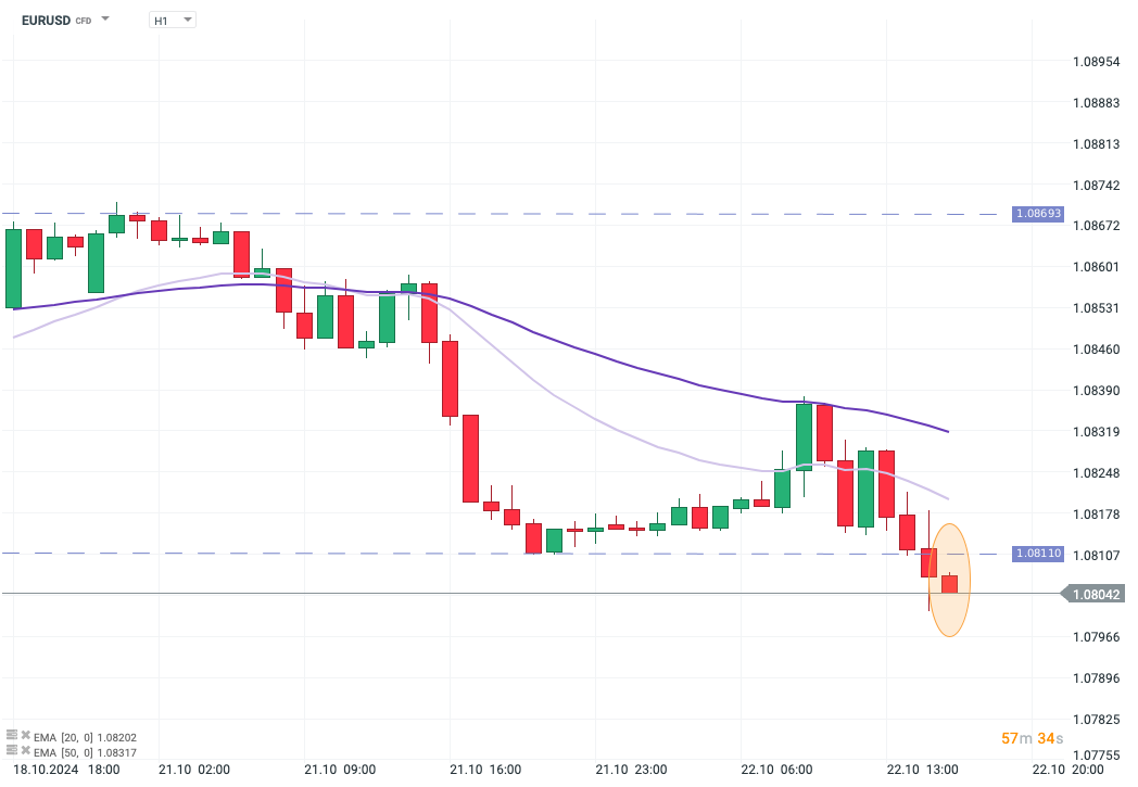 Głowny wskaźnik dot. produkcji przemysłowej wciąż znajduje się na minusie, jednak jest to pierwsza próba wyjścia z tendecji spadkowej od czerwca. Istotny progres zaliczył subidneks dot. usług, który wyszedł z negatywnego terytorium. W reakcji na dane para walutowa EURUSD coraz silnie schodzi poniżej ostatniego wsparcia w okolicach 1.0811. Ostatnio dolar był tak silny wobec euro na początku sierpnia.