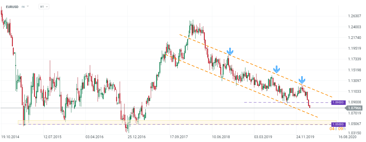 Nie ma wytchnienia dla pary EURUSD, która zniżkuje dziś piątą sesję i jest notowana poniżej 1,08. Tak nisko kurs nie był od kwietnia 2017 roku! Bilans nowych informacji pozostaje niekorzystny dla euro- sprzedaż samochodów w Europie w styczniu wypadła bardzo blado, podczas gdy indeks nowojorskiego Fed wzrósł do poziomu najwyższego od maja 2019 roku. EURUSD pozostaje w silnym kanale spadkowym, a strefa wsparcia to dopiero 1,05.