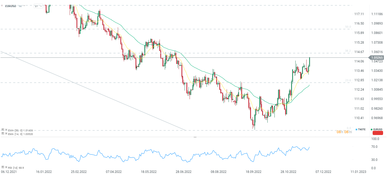 EURUSD powyżej 1,05 po tych słowach. Jak widać nie ma co liczyć na podwyżkę o 75 punktów bazowych. Pytanie jednak, czy będzie to jedna podwyżka o 50 pb i następne po 25 pb czy jednak Fed zdecyduje się na przynajmniej dwie podwyżki o 50 pb. Co więcej, jeśli inflacja faktycznie ma mocno spowolnić, biorąc pod uwagę wyraźne osłabienie gospodarki i rynku pracy, nie jest wykluczona obniżka pod koniec przyszłego roku.