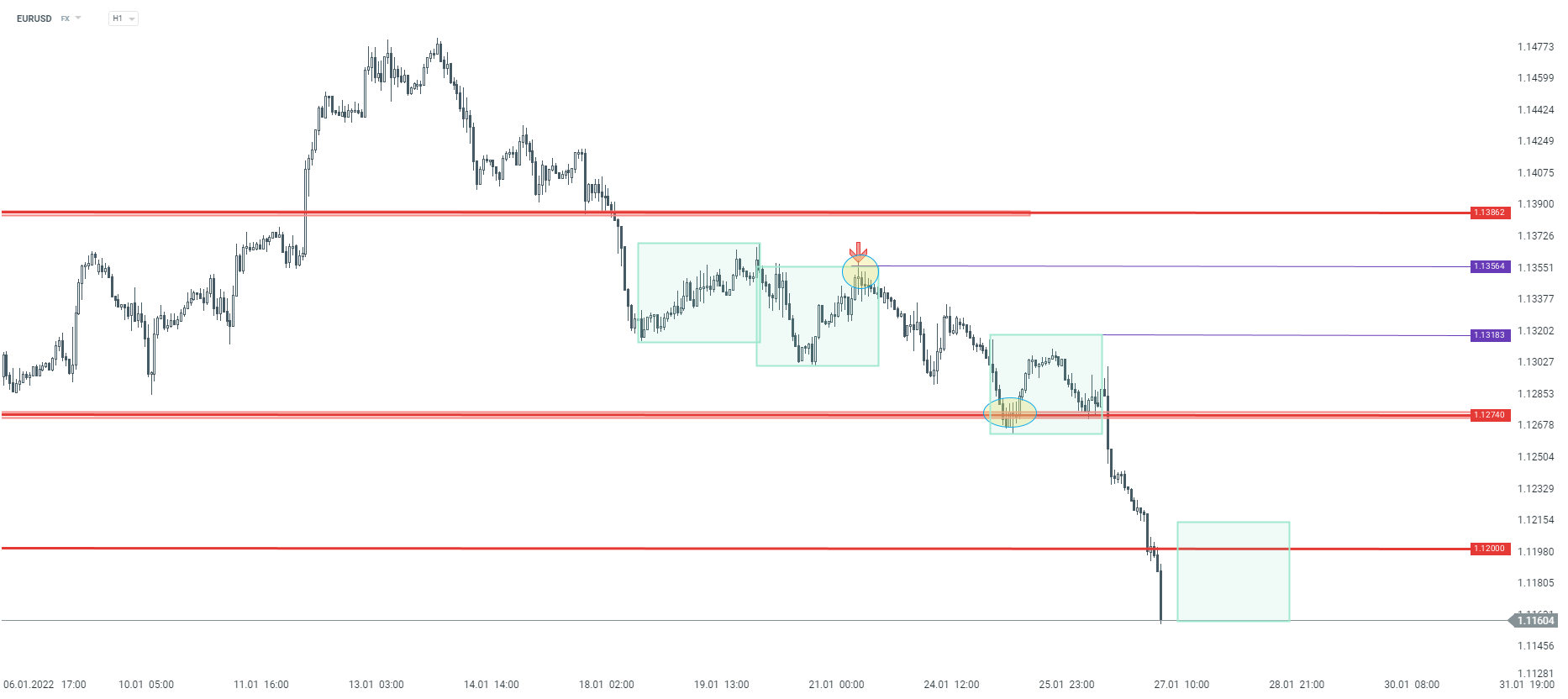 Jeśli chodzi o niższy interwał czasowy, zarówno godziny nocne, jak i dzisiejsza sesja europejska, przynoszą swobodny ruch w dół, bez większych korekt. Po przebiciu poziomu 1,1200, przestrzeń do dalszego spadku została otwarta, a żeby myśleć o zmianie sentymentu, notowania musiałby zanegować lokalny układ 1:1 - zielony prostokąt. Jednak w pierwszej kolejności jego górne ograniczenie powinno stanowić ważny opór intraday.