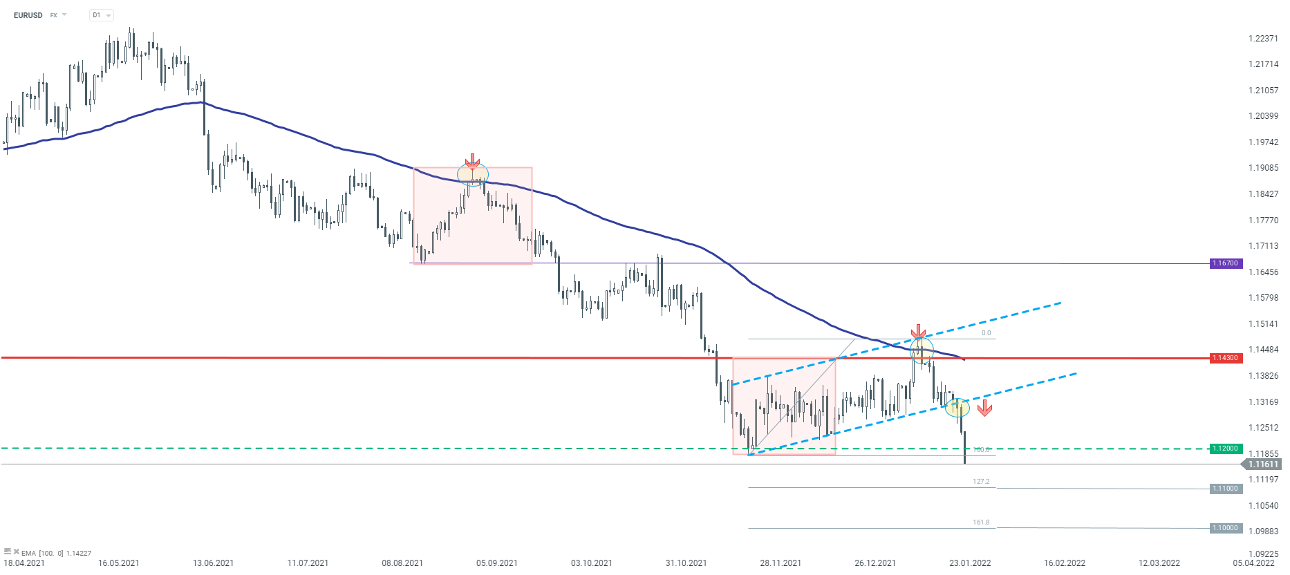Zgodnie z naszymi wcześniejszymi założeniami, nontowania EURUSD kontynuują ruch w ramach trendu spadkwoego, co jest wspierane przez wczorajsze jastrzębie wypowiedzi prezesa Fed - Jerome Powella. Kurs głównej pary walutowej spada dziś poniżej poziomu 1,12 USD i znajduje się najniżej w tym roku.